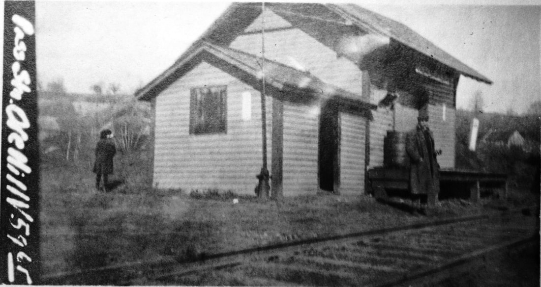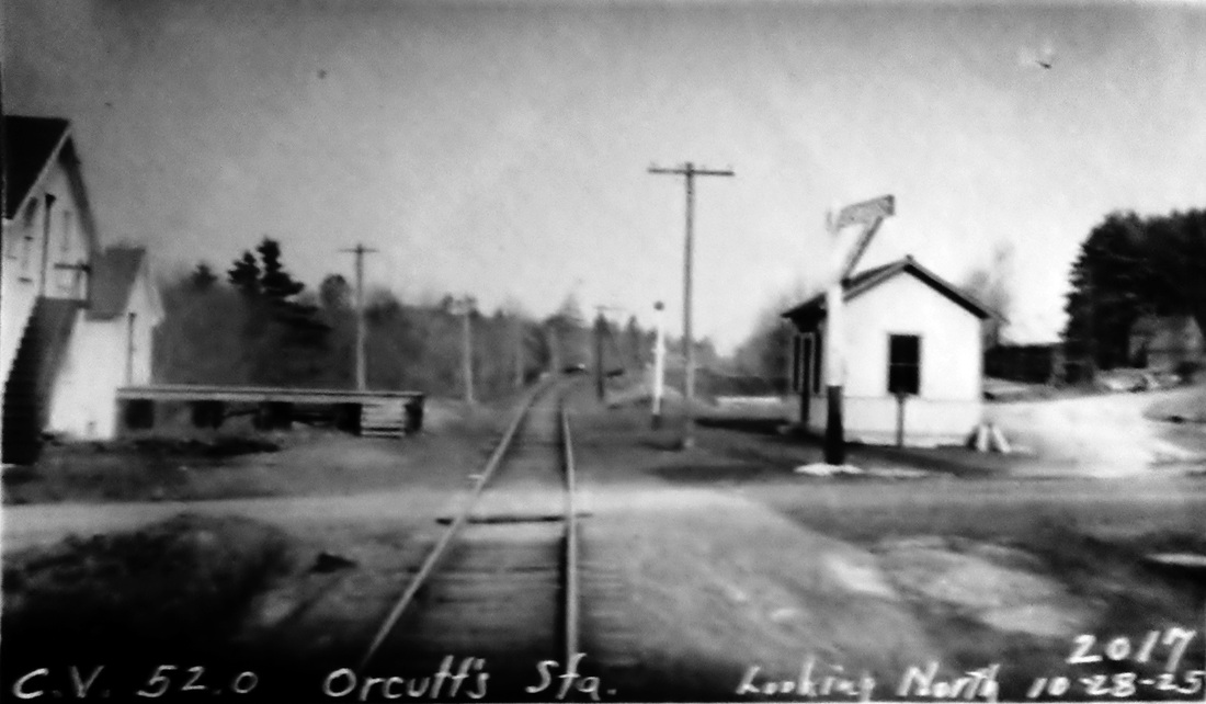The railroad commissioners note the building of a new depot here in their annual report covering the year 1876. The shot at [1] looks north toward the depot in the distance from the Orcuttville mill complex and reportedly dates to 1903. The 1917 val map at [2] shows the layout of the station area. The depot, in the northeast quadrant of the grade crossing, is shown by our red arrow. The PUC inspection photo at [3] is dated 10/28/1925. Irving Drake poses for the Lewis H. Benton shot at lower left on 10/12/1933. According to information from John Roy, this structure has been moved from its original location on Rte. 319 and is still standing nearby. It may become the property of the local historical society at a future date. His March, 2013 photo is at lower right. [REFS: CRC24.1877.18][rev090816]