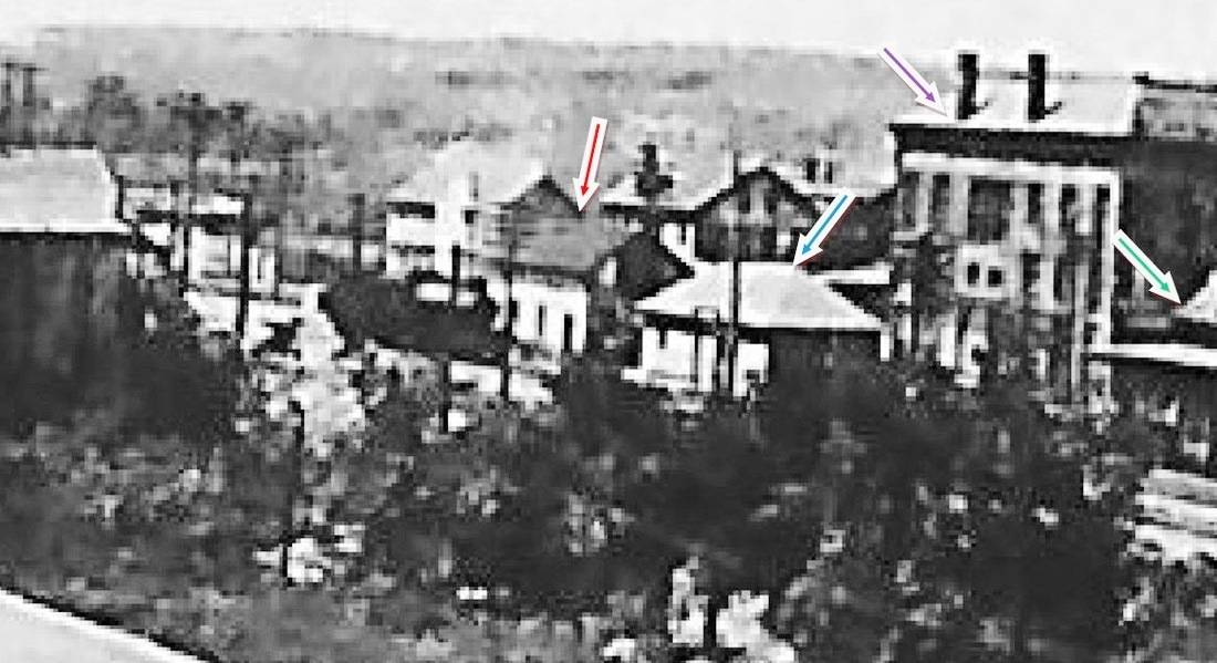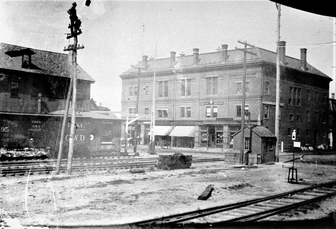 The newspaper said that, upon the 7/3/1905 closing of the old station, that now the "baggage room will be found in the Adams Express Company's building and in the tinsmith building a few feet below, the Western Union and ticket offices and a small waiting room for both sexes." The great image at [1] shows PUTNAM3 in the tinsmith shop, restaurant sign at left, station signboard at center and order board apparatus at right. The hip-roofed Adams building is next north and the Mansard-roofed Chickering House is behind. In the overview image at [2] our red arrow points to the tinsmith shop depot, the blue arrow points to the Adams office, the green arrow points to the overhang at the old depot and the purple arrow shows the Union Block, a building which which stood until 1966. The view at [3] looks at the Union Block from the Main St. crossing; note the Putnam Patriot newspaper's sign on the second floor. Also seen are the guard shanty, a Great Western Dispatch 'fast freight' car, lettered TH&L likely for the Terre Haute and Logansport RR, and the man atop the telegraph pole in front of the car! This depot arrangement served for three years until 6/16/1907 when the paper said that "railroad men were busy today moving from the temporary station into the new station." Construction challenges and a court injunctions over cost overruns were responsible for the delayed opening. Many thanks to Bill Zamagni for his clarifications and for bringing the AHS photos to our attention. [REFS: HC/07/04/1904/14; HC/04/20/1906/18; HC/06/11/1906/17; HC/06/20/1906/18; HC/08/01/1906/12; HC/01/17/1907/15; HC/01/ 23/1907/18][rev061117]