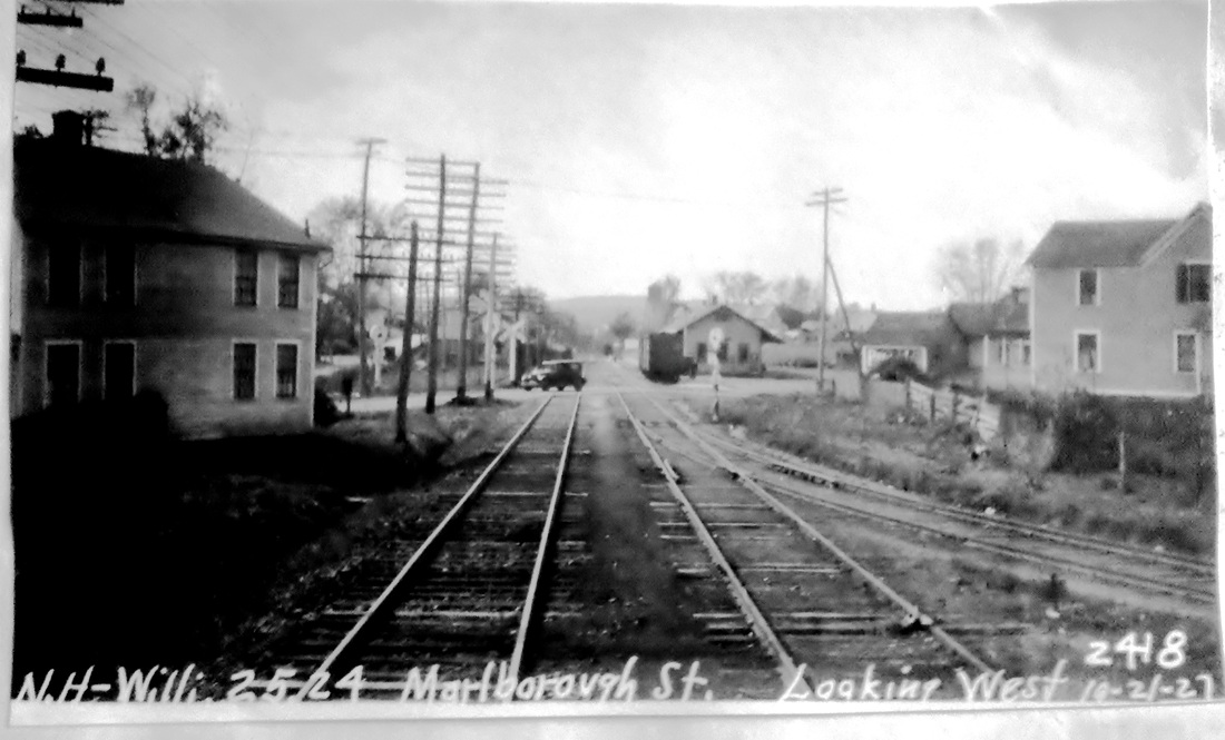 The lower right photos show the freight portion of the depot, the only extant part, on the remaining depot property. We do not know what happened to the passenger portion, the eastern two thirds of the original combination station. The stub-ended Air Line now stops here also, just west of the former Rte. 66 crossing. The shots all look back toward Middletown and the Connecticut River bridge that is just out of sight in the distance. According to John Roy, this station was 'downsized' sometime after 1931 and restored after 1996. [REFS: R82]