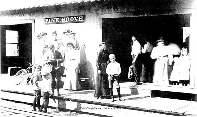 According to NHRR real estate records, this station in the town of Canaan was built in 1873. It served the Methodist camp meetings that some sources say went back to 1856. The first mention we find in the newspapers is in the Courant in 1867, which said a six-day meeting would be held along the line of the HRR, midway between Falls Village and North Canaan. Many religious associations deliberately located their grounds along railroad lines to make the events accessible, like at the CAMP STATION depots in Plainville and Willimantic and at GOODSPEEDS in Haddam where Camp Bethel was served. Whenever it was built, a newspaper article in 1877 reported that "the debris of the camp meeting station building belonging to Housatonic R.R. Co. and located at the grounds of the Pine Grove Camp Meeting Society, between this place and Falls Village, and which was blown down, and blown pretty much all to pieces in a gale in the last part of December, is now entirely cleared away, and nothing but the platform and floor of the structure remains. It is presumed the building will be rebuilt before the advent of the next camp meeting at these grounds." No photo of this station, which may or may not have looked like the next one, has been identified. [REFS: HDC/08/03/1867/08; HDC/08/22/1873/04; CWN/02/23/1877/02; CWN/08/26/1885/03: 1860 first camp meeting][rev021918]