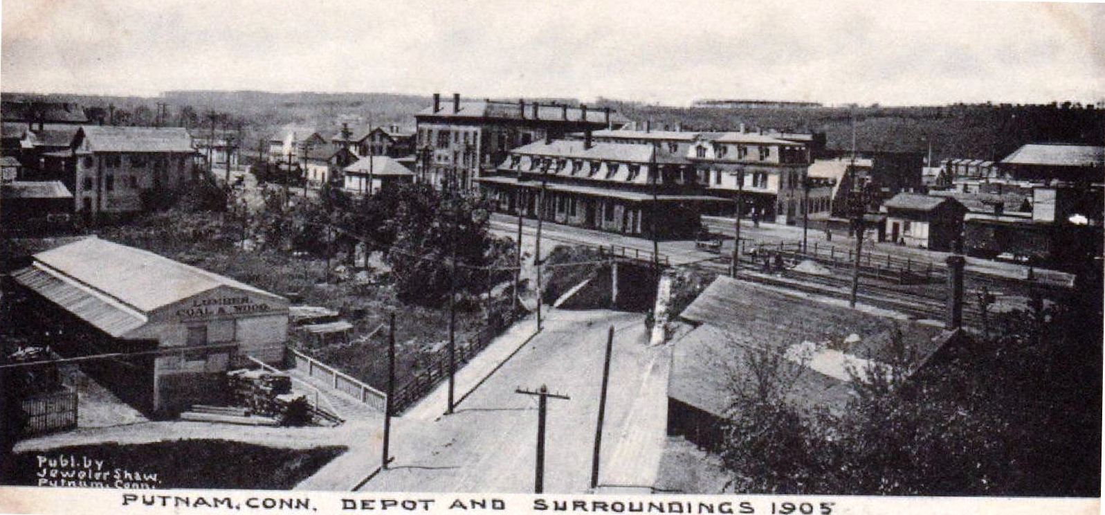 The Springfield Republican tells us on 11/15/1869 that this station had just been completed. An 11/20/1869 Hartford Weekly Times piece relays accolades, probably with a slight delay from the newspaper it quotes: "The new depot of the Boston, Hartford and Erie railroad at Putnam will be completed and occupied in two or three weeks. The [Windham County?] Transcript says of it: -- 'It is the most beautiful structure of the kind in Eastern Connecticut, and the finest architectural ornament of our village. It is not only tasteful in style, but commodious in all its internal and external arrangements, and the Boston Hartford & Erie Railroad Company have gained the gratitude of the people of Putnam and vicinity for this generous contribution to the material beauty of the place and to the convenience and comfort of the public.'" The handsome Second Empire, Mansard-roofed station had dormers and a bracketed cornice outside and, in addition to the usual ticket office and waiting rooms, a restaurant on the north end inside. The 1877 Bailey bird's-eye map at [1] portrays it correctly as sitting atop Front St. The shot at [2] looks north with locomotive #169 of the NY&NE, BH&E successor as of 1873, letting off steam at left as it waits with a train heading for Willimantic. N&W #20 also chuffs at right as it is about to head south for Norwich. The same view at [3] shows the ca. 1895 Adams Express building at the Main St. crossing. The 1890 real estate map at [4] shows the depot between the tracks of the BH&E and N&W. The great postcard image at [5] captures the "Old Depot" as a pretty busy place; note the NY&NE locomotive at extreme right. The 1905 view at [6] shows the Front St. 'tunnel' under the two widely separated sets of double tracks. Plans were drawn up in 1904 to widen the underpass from 18 to 50 feet and to realign the four tracks onto a narrower overgrade bridge, watertight so that "people passing under shall in no way be inconvenienced by drip or filth." The potential for that drip is seen in the photo at [7] which pictures a buggy headed east under PUTNAM2. Work began in June and "the old railroad station, which has been in use for thirty or more years, was closed for good..." on 7/3/1905. [REFS: WCT/11/11/1869/00 - need to get; SR/11/15/1869/08; WMS/12/10/1869/04; CC/11/20/1869/04; HWT/11/20/1869/02; HC/02/04/1904/02; HC/11/29/1904/02; HC/02/27/1905/13; HC/05/26/1905/14; HC/07/04/1905/14; K107] [rev102917, 061319]