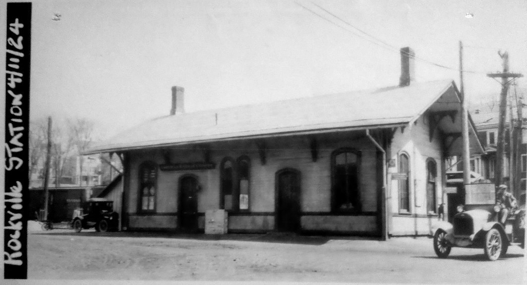 This was the terminus of the Rockville RR in the village of that name in the town of Vernon. According to the Courant, most of the branch track was laid, the depot was nearly finished, and workmen were laying the foundation for a 75-ft long freight house in early July, 1863. There was talk of the possibility of a new depot in 1903 when wires were being strung for the trolley operation to Hartford and Melrose, but we have never seen any photos of a station other than this one, which we have to conclude is the one built in 1863. The 3/15/1939 SSRR addendum says this station has been retained and is partly rented to Express Co. Its ultimate fate is not yet known to us. [REFS: HDC/07/02/1863/02; CRC43.1895.23; HC/03/03/1903/02][rev010518]