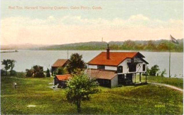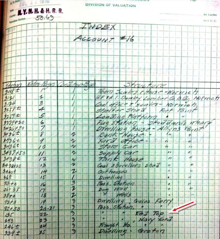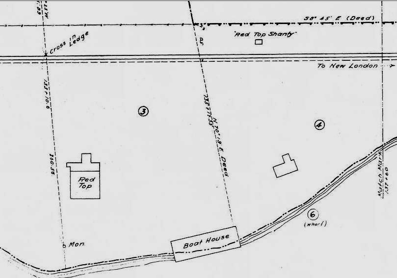 This was a later stop on the N&W in the town of Ledyard between GALES FERRY and NAVY YARD connected with the annual Yale-Harvard boat races. While the Elis were headquartered at GALES FERRY, the Crimson located just to the south in a structure reportedly built in 1881 with the red roof that occasioned the name. 'Red Top, Conn.' is the dateline location in New York Times articles covering the race in the early 1900s. The Harvard quarters remain at this location today [click here]. A 1900 Register article reads as follows: "Red Top, the Harvard quarters, a half a mile down the river, is deserted but the building and grounds where the crimson will be located after their arrival next week, have ben [sic] put in the neatest condition imaginable for their reception. The New London Board of Trade and the Consolidated railroad have seen that the building was given a number of minor but badly needed repairs and the grounds were cleaned and mowed. Red Top now looks like a well-kept country seat with a carefully trimmed lawn. More visitors than ever before will visit the oarsmen at their quarters this season. They'll take advantage of the new branch of the Consolidated Railroad and the new trolley line from New London to Norwich..." In anticipation of the 1899 opening of the "new branch" from ALLYNS POINT to GROTON, the NYNH&H actually bought the Harvard crew property in 1898 and apparently leased it to the team thereafter, which might explain why the railroad is fixing up the property in 1900. In spite of all this early activity, RED TOP is not seen as a timetable stop even in the 1907 Official List. We catch it for the first time in the ICC's 1916 field notes and it is gone by the 1923 Official List. With later service cutbacks on the N&W line, perhaps Harvard continued to have rail access by special arrangement. The ICC labels RED TOP a passenger station on the field-notes index page at left, not a 'shelter shed' like FORT POINT or a 'flag station' like STODDARDS WHARF and the val map at right shows a 'Red Top shanty,' as well as the quarters building and boathouse. We will recheck on our next trip to the National Archives for a photo or more detailed information on this station, as well has how to decipher the terminology that the ICC used for labeling structures. [REFS: NHER/06/18/1888/01; NYT/06/28/1893/09; HC/09/12/1898/09; NHER/06/07/1900/01; 1907OL: no; 1919ICC: yes; 1923OL: no][rev1210312]
