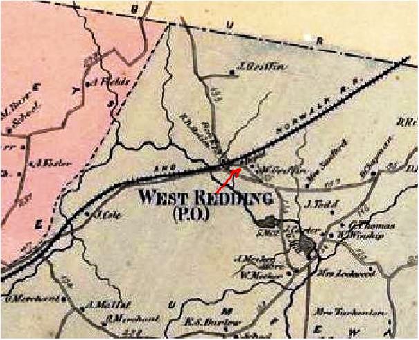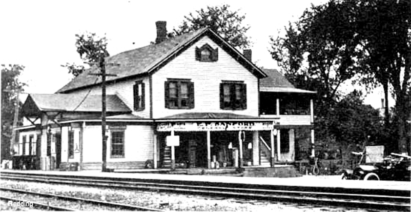 Seen west of the track on the 1856FC map at left, the stop was established in 1852 when the D&N opened. The 1868 map on the right not only has that first 'station' shown, but it also shows a 'depot' on the east side of the track, probably indicating the structure that we have now listed as REDDING2. Just what the first station looked like, we do not know. Also called WEST REDDING for the section of the town where the railroad built, this stop would receive passengers for the camp meeting ground nearby, later transformed by the D&N into BROOKSIDE PARK. [rev040113]