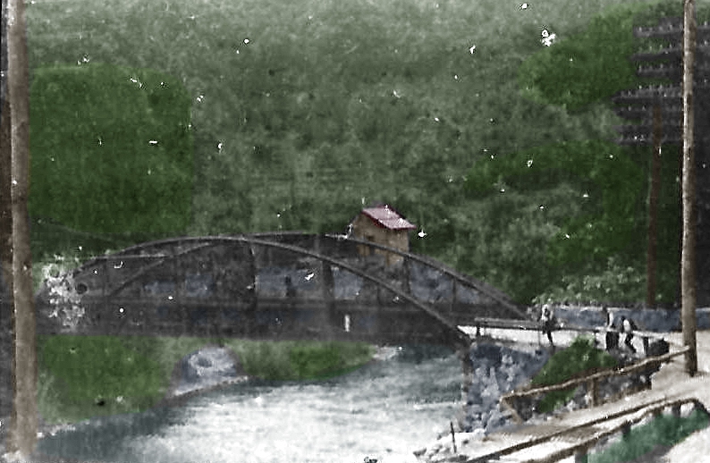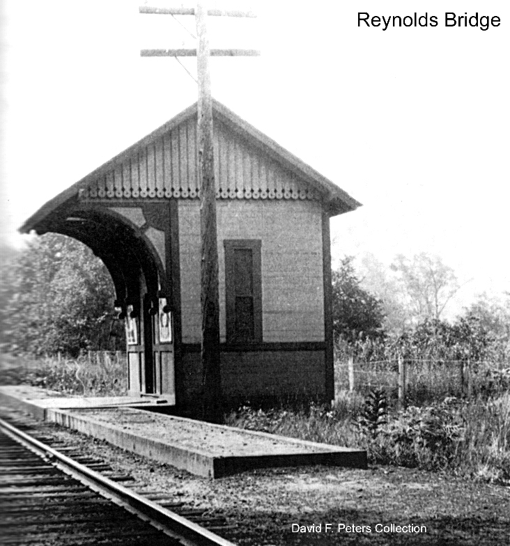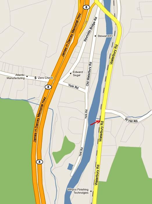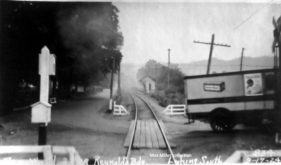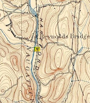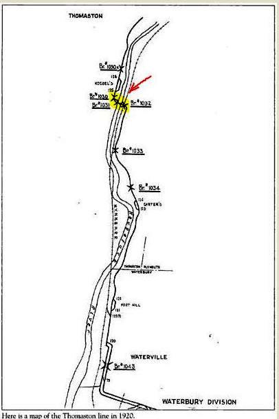 The first listing we have for this station in the town of Watertown is in 1864, and though its timetable appearance thereafter is a bit erratic as a flag stop, it is on all the RRM maps from 1876 onward. The photo at [1] is undated. Al Weaver colorized the shot at [2], making the station more easily visible. We think the view looks south from the west side of the river. In the foreground is the trolley line from Thomaston, which crossed the river just south of here, as seen highlighted in yellow on the map from the book Waterbury Trolleys at [4]. The NRR itself recrossed the river to the east side where the station is seen below its namesake highway bridge. The 9/17/1924 PUC photo at [3] looks south on the at the station on the west side of the NRR track. REYNOLDS BRIDGE is still on the official list of 1923 but is gone in 1928. According to materials in the Leroy Roberts Collection, soon to be at UConn, the 10x15-ft, slate-roofed structure was moved here on 5/8/1925 to serve as CAMPVILLE3, replacing the depot that had just burned there. A 1926 Courant article tells us that REYNOLDS BRIDGE, BURRVILLE, CAMPVILLE, EAST LITCHFIELD and FLUTEVILLE were about to lose their passenger trains in 1926, likely due to trolley competition. All service from Waterbury to Winsted was being reduced to two round trips by steam train and four by gas rail car, with the yard at the latter place being closed "as no trains are to lie over there" any more. The 1892 topo map at [5] pinpoints the location of this station. The red arrow shows the same point on the present day map at [6]. The 'new' Reynolds Bridge crossing is seen at the top of that map where it spans both the railroad track and the river. The beautiful concrete arch structure, still in use today, opened on 5/18/1928. [REFS: NYH/11/27/1870/07; HDC/05/12/1876/01; CRC34.1886.57; SR/09/10/1896/07; HC/12/13/1906/15; HC/06/20/1926/A12; HC/05/13/1928/03; D89] [rev100112, 110820]