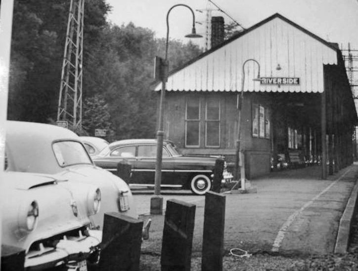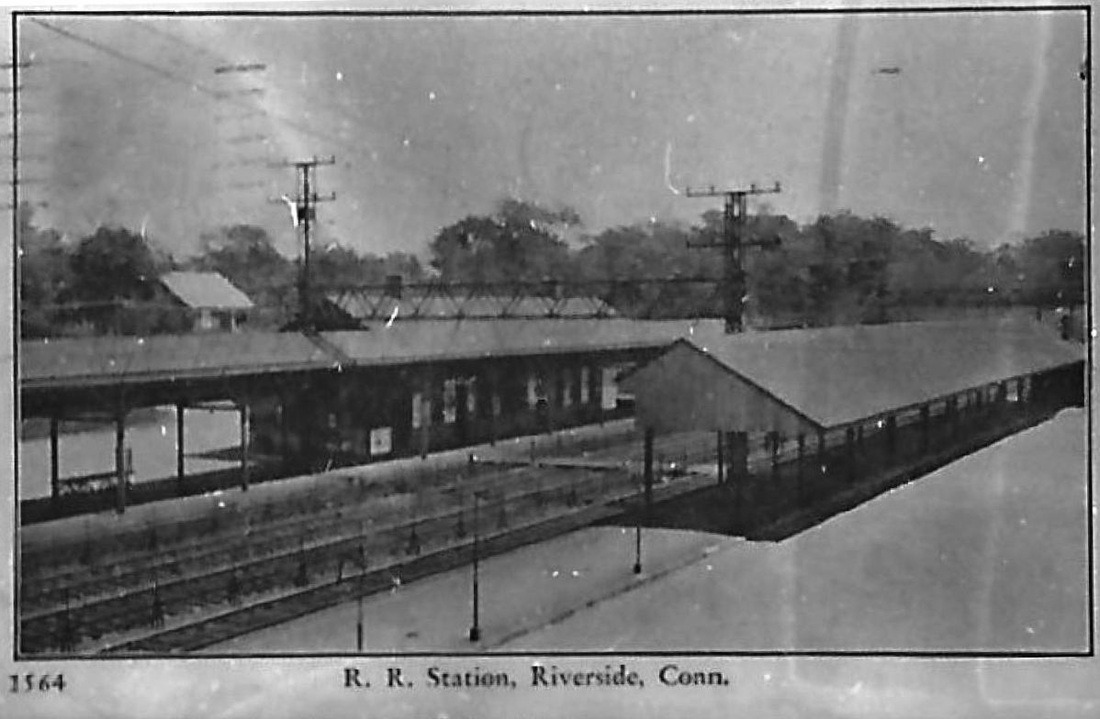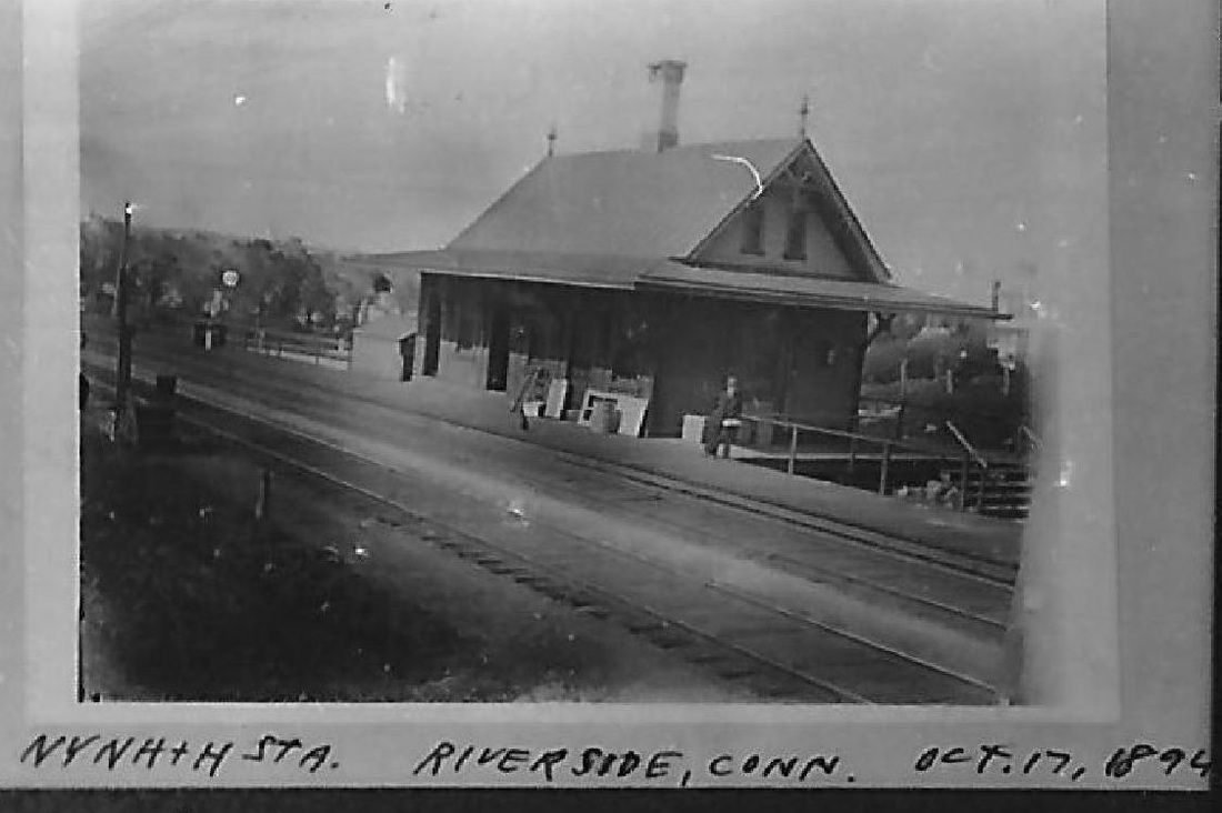 This stop on the east side of Cos Cob harbor in the town of Greenwich was established in 1869. A February, 1869 newspaper article said: "The New York and New Haven Railroad Company intend rebuilding that section of the bridge at Cos Cob, which was destroyed by fire about three [sic] ago. The materials will be of wood and iron, put together in the most substantial manner. The company also intends erecting at Riverside, at the eastern end of Cos Cob bridge, a fine brick passenger depot." Also mentioned in the Register in 1872, it is seen in timetables thereafter as well. This photo shows a sizeable structure and the 1894 date is supported by the two-track main line that would be doubled in size shortly. It looks to us like that station, true to its name, is situated on the riverbank itself, with the railing for the bridge across the harbor seen right behind it. That would put it on the westbound side of the tracks. [REFS: CC/02/27/1869/02; CR/06/08/1872/03; CRC29.1882.103; NHER/06/09/1882/01; NHER/05/13/1893/04; NHER/07/17/1894/01; R85][rev011813]
