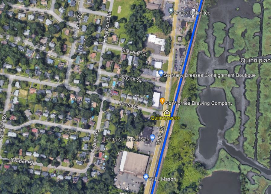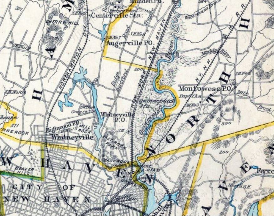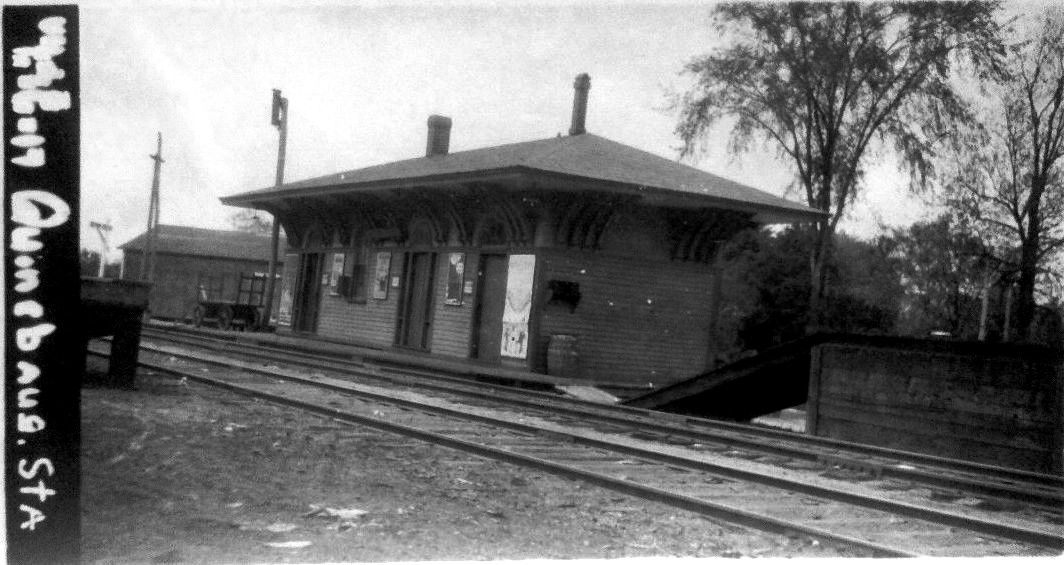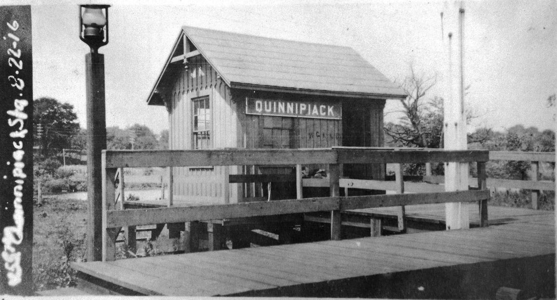 This stop in the town of Hamden was created late in 1871 according to a Register article which said that the NYNH&H had just located a new station there, half way between New Haven and North Haven. The article goes on to say that most people would be very surprised to know that the Hamden town border reached as far east as the Quinnipiac River. Though the stop was announced as EAST HAMDEN, apparently the proximity to the nearby river won out, with the variant spelling of QUINNIPIACK. The valuation photo at [1] shows a trackside view on 8/22/1916; note the post at right with wires or ropes for raising and lowering the paddle to stop trains at this flag station. The street-side view at [2] is undated; the structure looks shabby but posters are still up. The 1893 Hurd map at [3] shows the location at dead center and the 6/30/1915 valuation map at [4] shows the footprint. 'FP' stands for frame (wooden) passenger station. On the snippet from our Track 11 Google Earth map at [5], it looks to have stood at the foot (pardon the pun!) of Foote St. where it meets State St. The first newspaper appearance we have found is in 5/30/1872 when the new fare from Hartford to here was listed as 95 cents; no old rate means to us that trains did not stop here much before that time. The stop is clearly mentioned in the newspaper then when a church group from NORTH HAVEN was stopping at this station "a few moments later" on the way to a picnic at the NRR's HIGH ROCK GROVE in Beacon Falls. Interestingly, the NYNH&H cars were to be switched to the NH&D, which was to run a "special train direct to the grove." This sharing of passenger train business is significant because at the time the NH&D was seeking legislative redress for discrimination by the two other roads in freight traffic. See Track 2, MP2.2.2. Passenger service seems to have ended here, as at many other locations, between 1925 and 1928. The QUINNIPIACK structure survives as CHESTER3, having been donated in 1975 to the Valley RR which restored it and placed it at Railroad Ave. and Grote Rd., the former site of CHESTER2. At [6] VRR No. 40 blasts past with a train on 6/9/2018. [REFS: NHER/09/22/1871/02; HC/09/23/1871/03; BDA/09/28/1871/02; HDC/05/31/1872/02; NHER/08/05/1879/04; NHER/07/01/1889/01: wreck on 6/29 just below station; NHER/05/07/1896/01; 12/2/1925 Form 220 LWTT: yes; 11/18/1928 Form 200 TT: no; R84][rev050722]