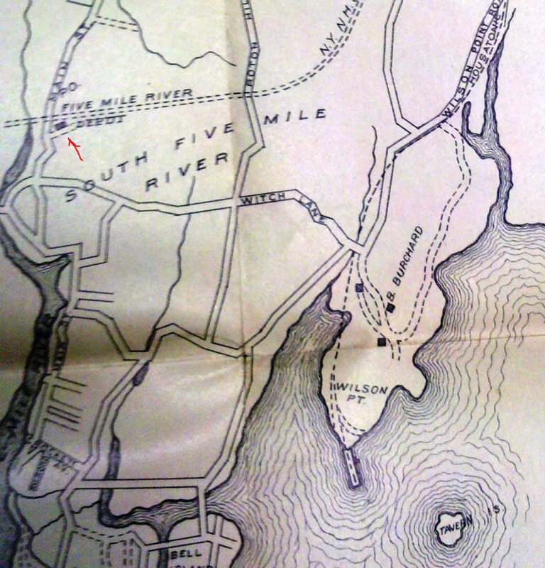 This section of Norwalk was originally known as Five Mile River, or South Five Mile River, for the waterway that empties into Long Island Sound here. Locals approached the railroad commissioners in 1866 to order the NY&NH to establish a station here but were told that the commissioners had no statutory power to give such an order. The railroad, however, acquiesced shortly thereafter, with the Columbian Register reporting in May, 1867 that "a new railway station has just been constructed on the New York and New Haven R.R., between Norwalk and Darien. It is called Rowayton. Resolutions of thanks to the New Haven road, Supt. Hoyt, and Capt. Godfrey, were unanimously passed, as well as to Mr. Vincent Colyer." Godfrey, a NY&NH director was "specially complimented" and may have been the the real force behind this move. In 1868, the Courant calls this stop SOUTH MILE RIVER, leaving out the FIVE that is seen on the ca. 1876 map at lower left. The map demonstrates an ambiguity, seen here and at other stations as well, with differing names for the post office and the railroad station. This confusion was likely part of the reason area residents were meeting precisely at this time to consider what the village should be called. To further add to the difficulty, the RRMs call this stop FIVE MILE RIVER until 1883 when they start listing both names, sometimes making them look like separate stops. There at least is agreement between the 1876 map and the 1893 map [lower middle] showing that the first depot was on the south, eastbound, side of the tracks. Our top left photograph, a rare view, thus looks toward New Haven some time between 1867 and the four-tracking of 1894. The 1917 val photo at top right shows ROWAYTON1, now on the north (westbound) side of the track, elevated on a higher foundation and converted to use as the freight house. On the 1938 SSRR list, this building is to be disposed of. The ca. 1900 city directory map at lower right shows the larger area and nearby WILSON POINT. [REFS: RRC5.23 (9/11/1866); SR/04/25/1867/04; CC/04/27/1867/03; CR/05/04/1867/02; NYHT/05/27/1867/06; HDC/03/09/1868/04; NYHT/05/22/1869/04; HDC/06/22/1871/04; 1871TT; HDC/08/22/1872/01; CRC21.1874.59; NHJC/07/11/1879/02; RRM1882; RRM1883; 1894TT; SA/11/16/2011/00][rev010518]