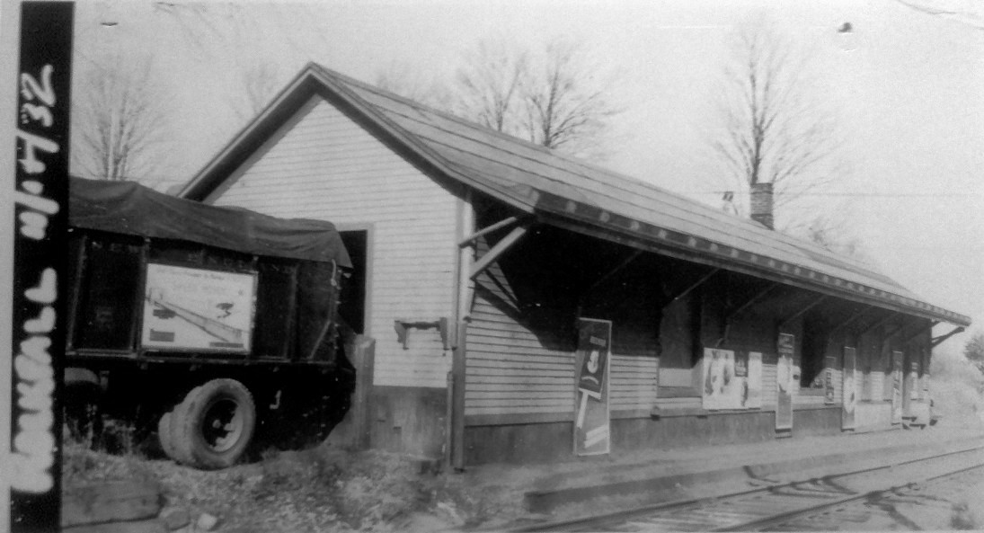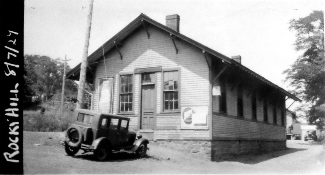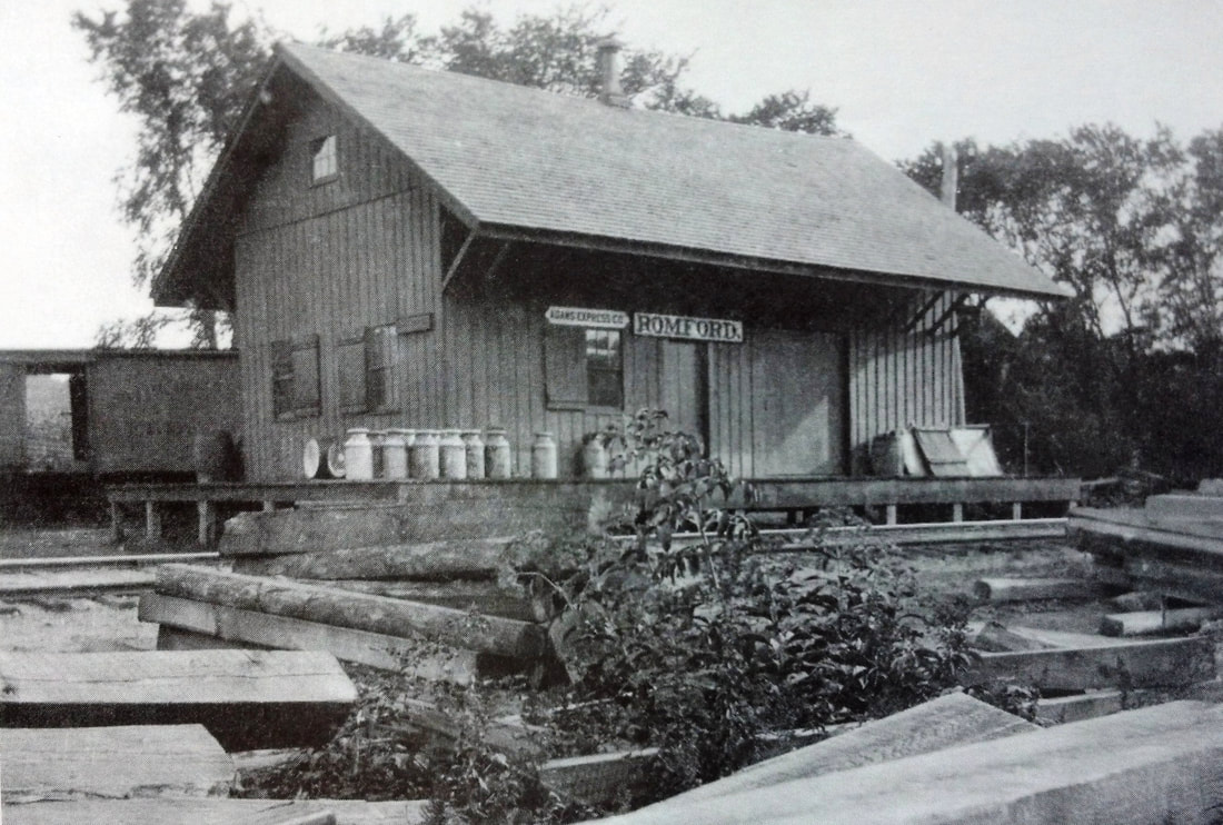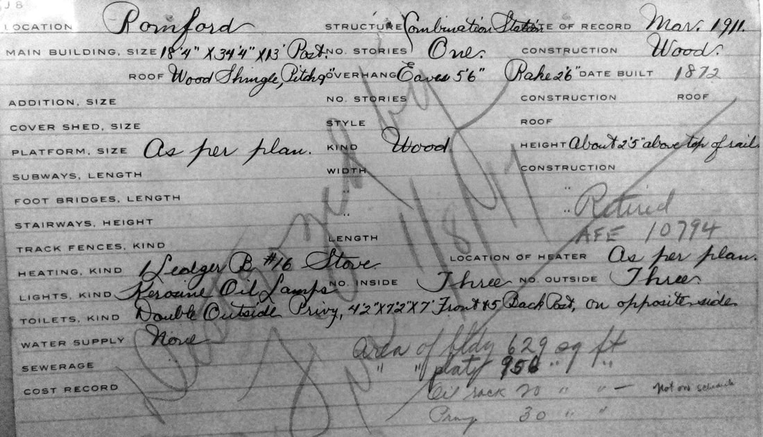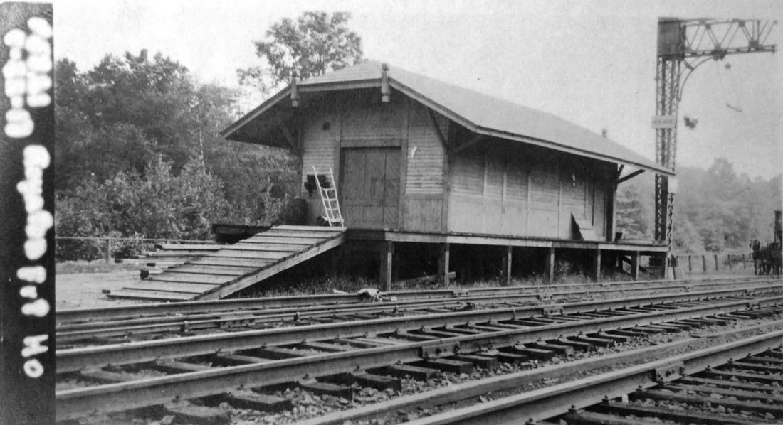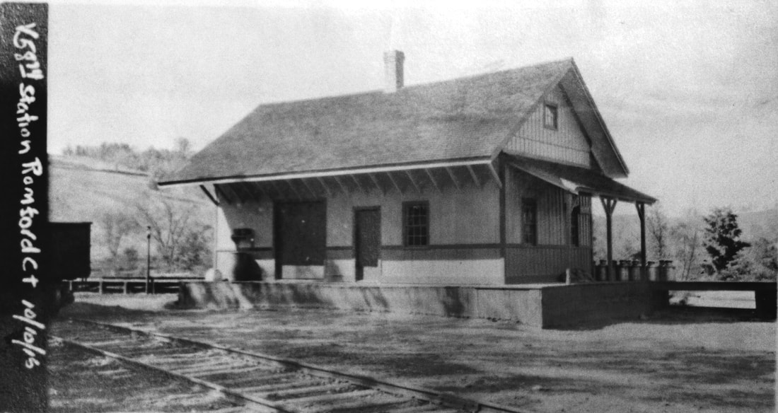 This basic combination depot was built in the town of Washington when the Shepaug Valley RR opened in 1872. It was named for the land donation by Romulous Ford who owned the area then known as Davi(e)s Hollow. A Romsford Station post office was established on 9/6/1872 and lasted until 2/15/1926. In a freak lightning storm on 6/4/1876 "... electric fluid following the wire about a mile..." traveled from a nearby farm to the depot roof, and thence knocked agent Archer Ford unconscious and onto the track as a train was approaching. He was pulled to safety in time but his "... right side and arm were scathed by the fluid...," the hope being that he was not paralyzed. The newspaper added... "Surely there is but a step between us and death." The ubiquitous Bee tells us that the platform was extended in 1906, "... making it much more convenient for passengers to get on and off the train." Bob Lord is apparently off a bit when he says that the station burned in the 1920s. In the Shepaug railroad collection, donated to the Litchfield Historical Society by retired railroader Ed Brady, there is a real estate card that says this station was destroyed by fire on 1/8/1917. No newspaper article to corroborate this date has yet been found.