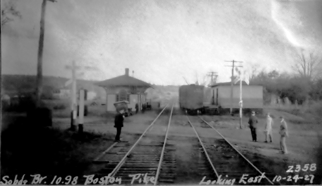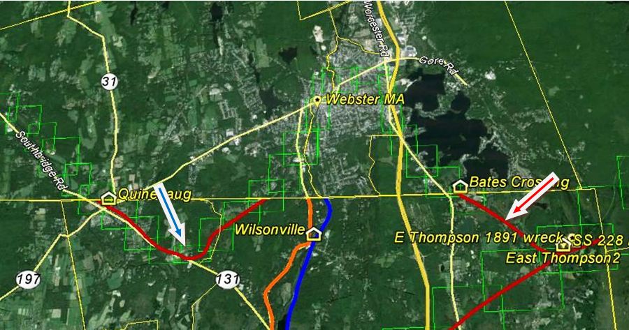 Rails were completed from EAST THOMPSON in 1866 and stopped here until the tracks reached the intended branch terminus at Southbridge in February, 1867. This stop was first called NEW BOSTON and is seen as such on our 1871TT. It became QUINEBAUG, often spelled with two Ns, in 1873, the reported reason for the change being confusion with another Massachusetts town of the same or a similar name, a fact we cannot verify. It appears under its new name on our 1875TT. The ICC valuation photo at [1] is probably dated 4/4/1917, as are many of the others in this area and the valuation map at [2] shows the station layout in 1915. The undated image at [3] shows the freight station south of the track and the passenger station beyond it. The shot at [4] is dated 3/17/1934. At [5] we see the PUC doing their annual inspection on 10/24/1927. This branch crossed the state line twice, creating two segments in each state. The snippet from our Track 11 Google Earth map at [6] shows the eastern segment up to BATES CROSSING at the red arrow and the blue arrow points to the western segment with QUINEBAUG. Southbridge branch passenger service ended on 8/15/1930 and tracks were torn out from East Thompson to Webster in 1937. QUINEBAUG was torn down in 1936. [REFS: BET/01/31/1865/02; NYH/09/24/1866/02; BDA/11/05/1869/02; BPO/08/19/1930/00; K111; SL12.2.13 (1981)][rev121917]