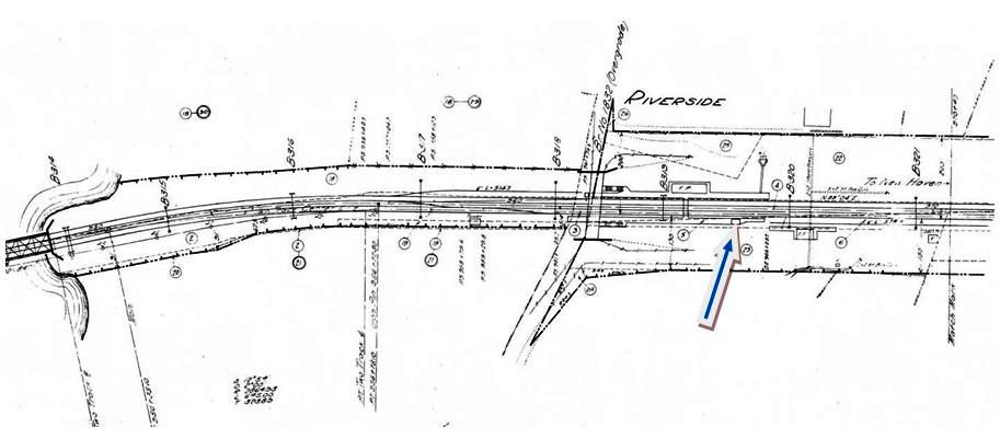 This brick structure was built on the westbound side to replace RIVERSIDE2. Based on the fact that the fire was in 1975, we have had to extend John Roy's 1945-1965 date range for this structure. No newspaper articles have been found on the actual opening, which may not have been until sometime after 1975. [REFS: R85] [rev011813]