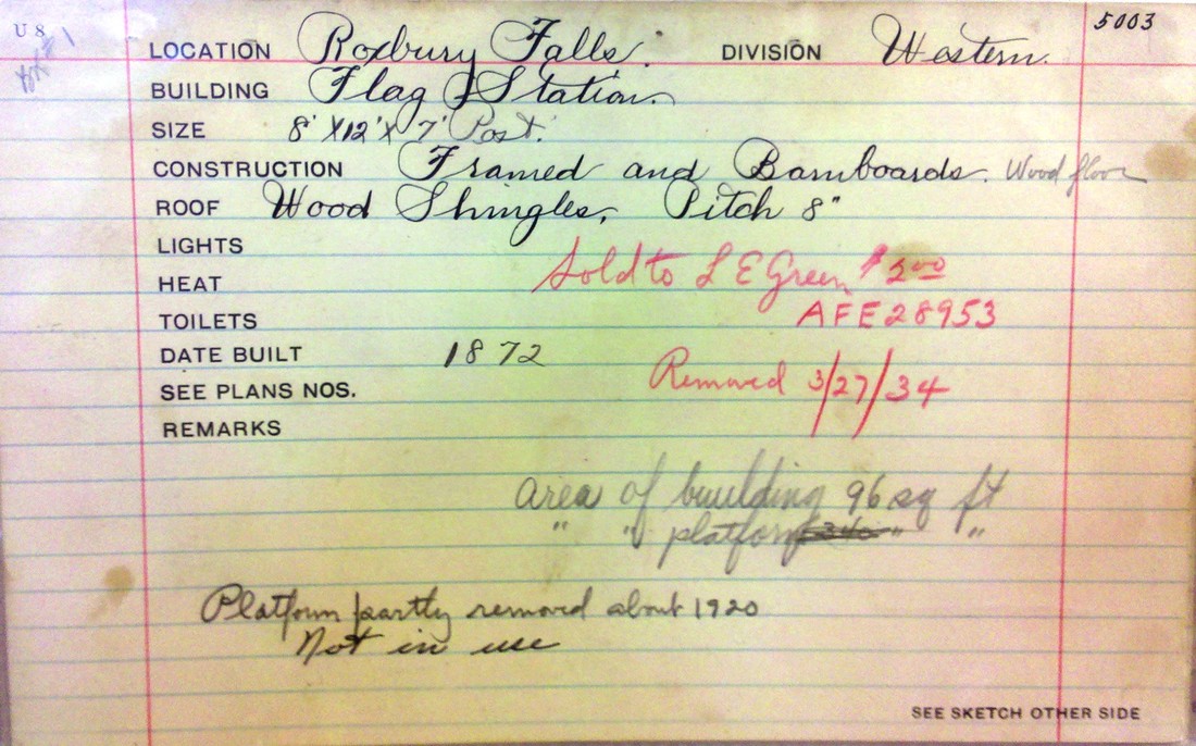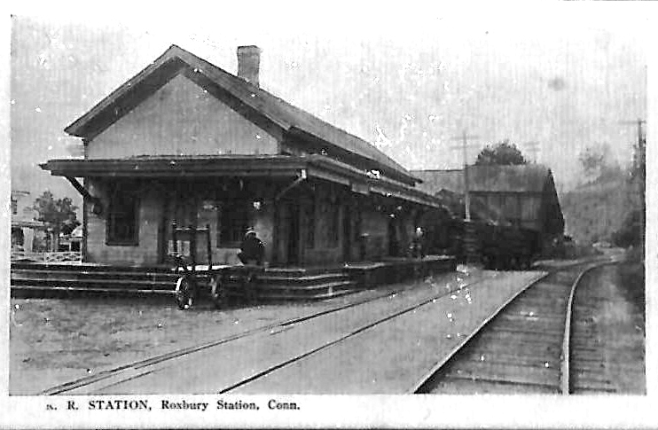 Flag stop established in the town of Roxbury in 1872 when the Shepaug Valley RR opened; the 8x12x7 depot opened in August of the next year. The val photo at [1] is dated 10/9/1916. The PUC photo at [2] looks south at the station on 10/14/1924; note the cans on the milk platform in the right foreground. The real estate card at [3] shows the structure, #5003 on the NYNH&H books, was sold to L.E. Green for $2.00 on 3/27/1934 per AFE 28953 and it was removed on 3/27/1934. The card also says that the platform was partly removed ca. 1920 because it was no longer in use. The last passenger train ran in 1930 and the branch was given up completely in 1948. [REFS: HDC/08/08/1873/04: depot built; D157, K61][rev122718]