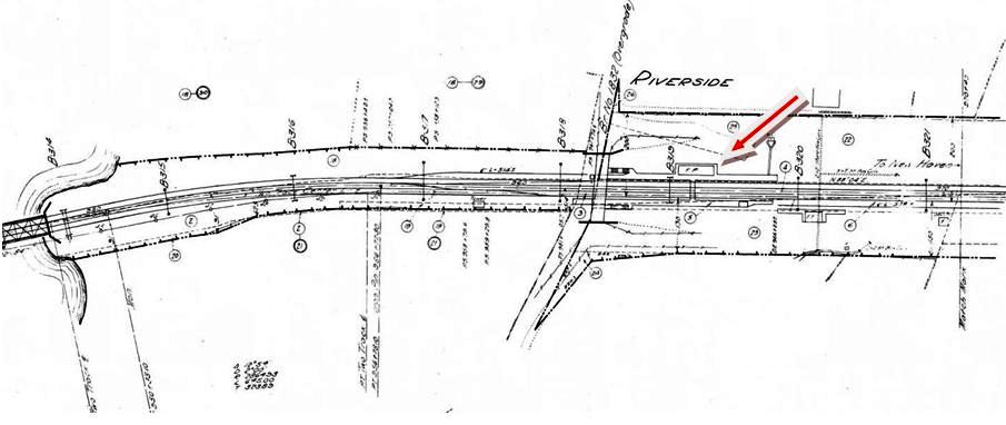 A new, canopied platform and small station on the eastbound side were put up at the time of the four-tracking. The station is seen in the photo at upper left and, though unmarked on the 1915 val map [add011813] at upper right, our blue arrow points to its footprint. The covered platform is on the right in the postcard view at lower left and RIVERSIDE2 is visible across the tracks on the westbound side. The old eastbound depots at most stops on the New York line were demolished by 1974 with the debut of the high-level platforms and M2 commuter cars. [REFS: HC/05/23/1974/95D][rev011813]