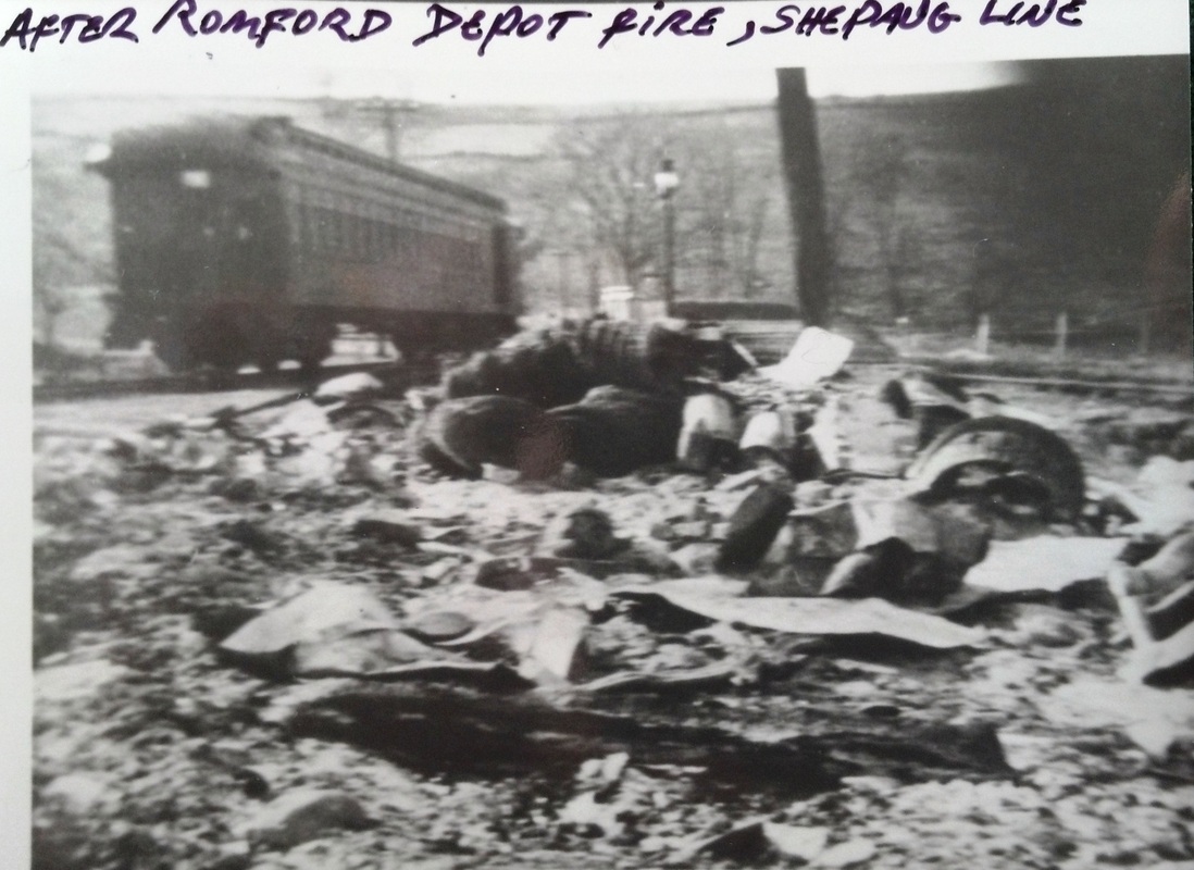 IMAGES: [1] 1/8/1917 fire aftermath looking west, railroad-south toward Hawleyville. Only depot chimney remains; temporary coach-station on house track. [2] 9/3/1924 PUC photo, coach is at right. [3] 10/1925 PUC shot looks north; coach to the left, out of service; small waiting shed on a raised platform serves as ROMFORD2.