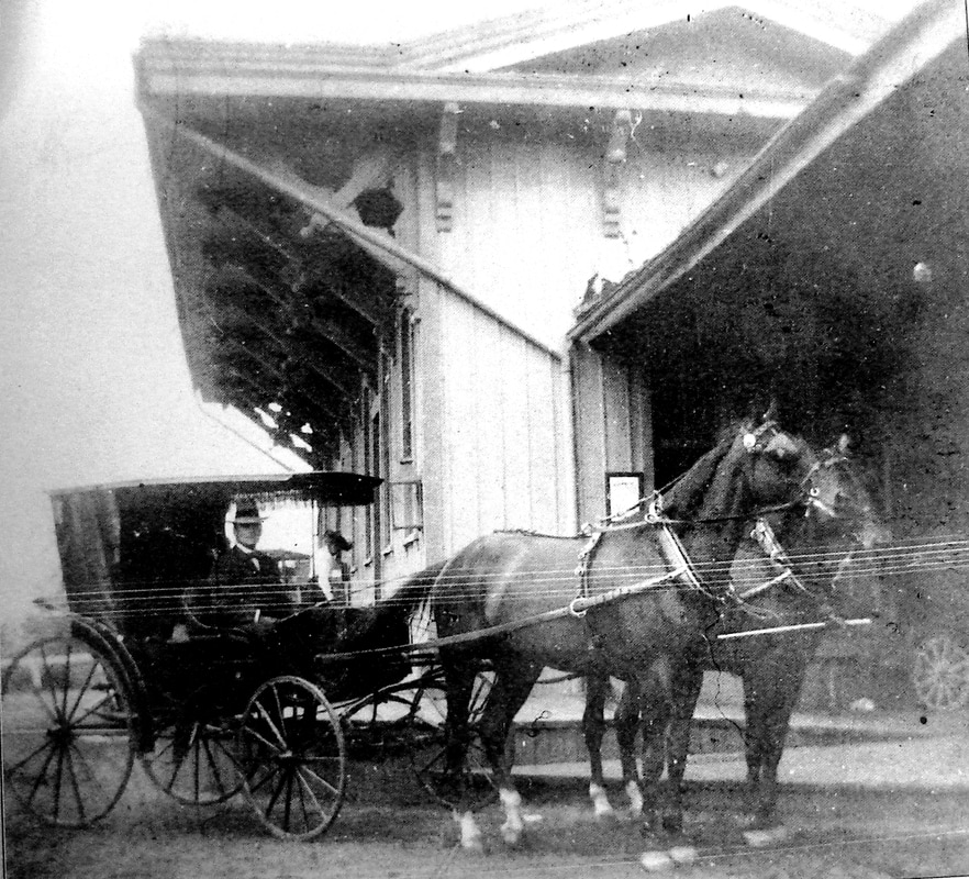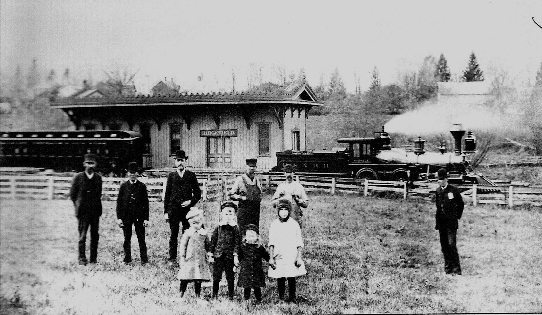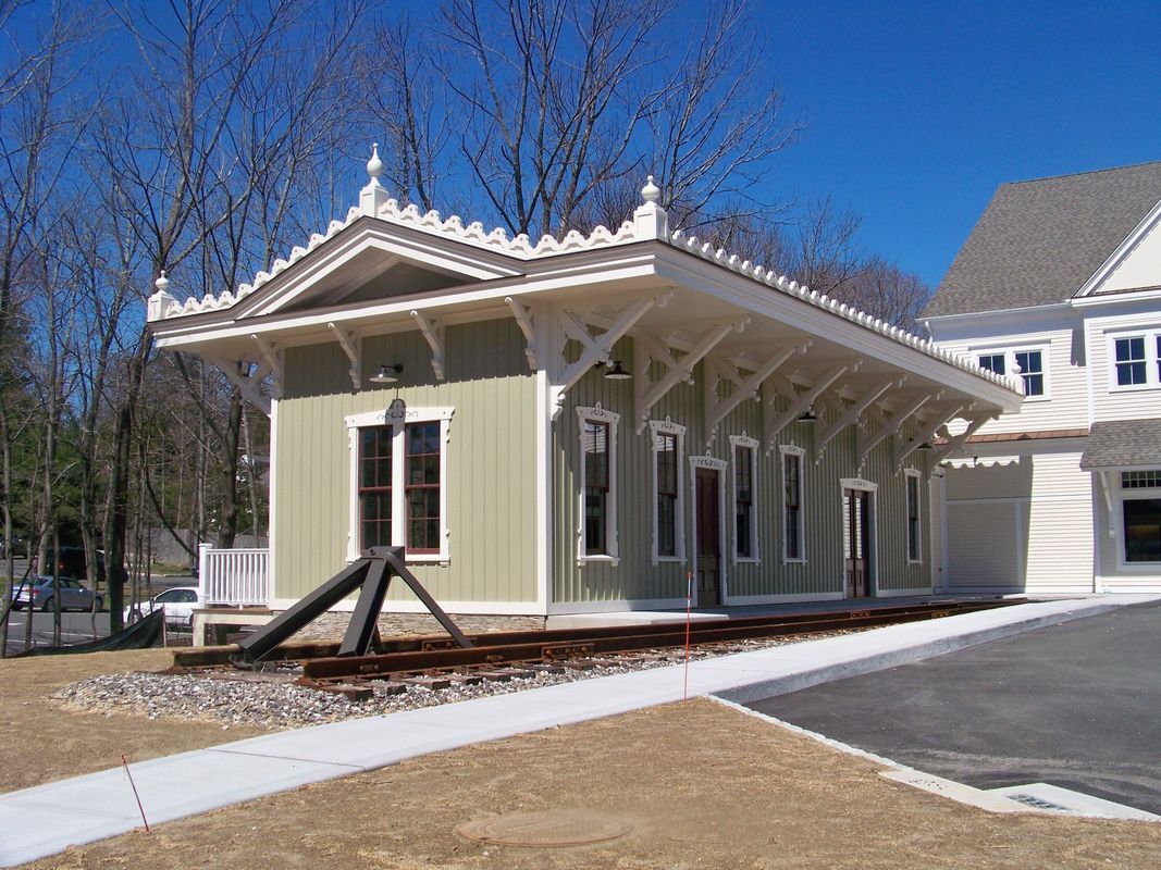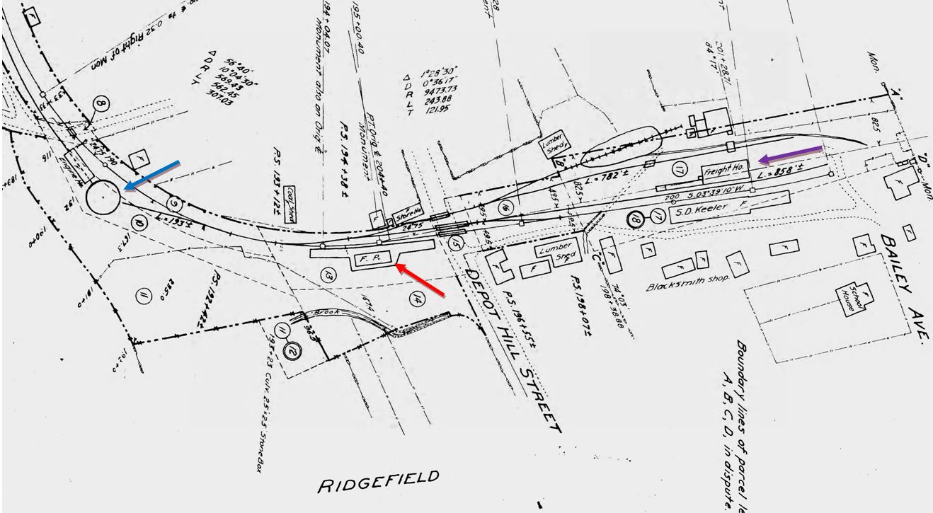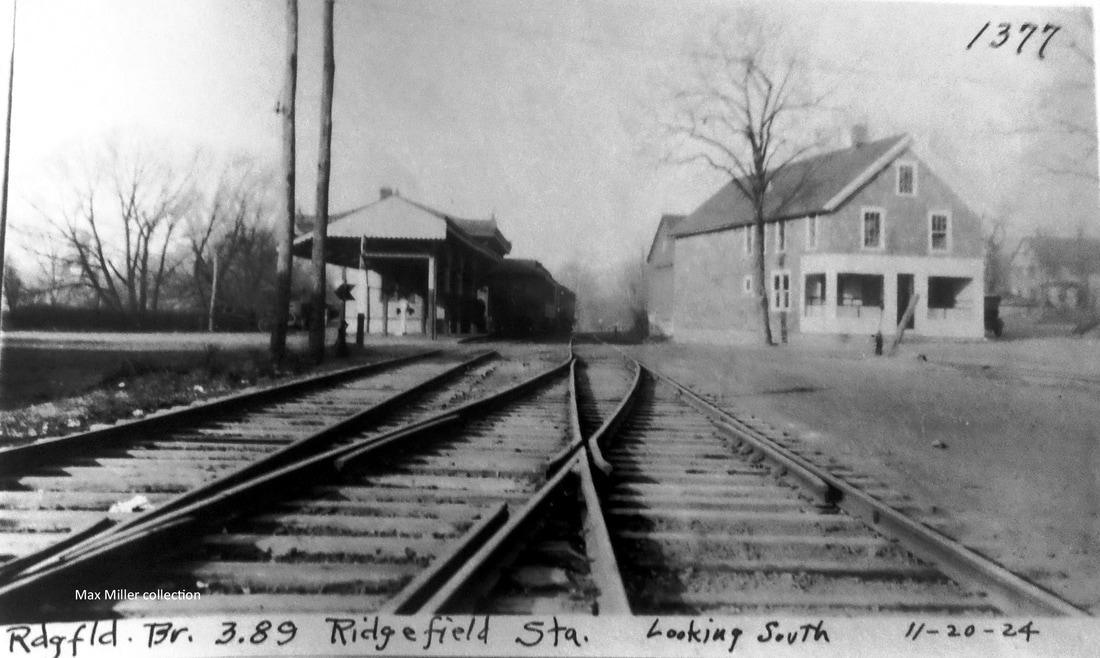 This depot was built in the center of town in 1870 as the terminus of the new line from the D&N main where RIDGEFIELD1 then became BRANCHVILLE1. The photo at [1] probably shows the station near the time of opening. The tall, derby-hatted gentleman in the center is said to be John Bacon, D&N superintendent and later a state railroad commissioner. Note the stack on the wood-burner which is releasing a sizeable plume of steam! Compass-north is to the left on the 1915 val map at [2] with the station [red arrow] on the west side of the track at what was then called Depot Hill St., now Prospect St. End of track is just south of the freight house, which is at the purple arrow. Trains in [3] and [4] are both face south, the engines presumably to be run in reverse to turntable [blue arrow] north of station. A surrey with the fringe on top awaits a train at [5]. The 11/20/1924 PUC shot at [6] looks compass-north but is labeled as looking south; we think the negative is reversed. Here the station is on the left (compass-west) with a train in the shadows and a store house on the right. John Roy gives 8/8/1925 as the last date of railroad use, part of the severe passenger service cutbacks of that year and Cornwall has a photo of a NETCo bus then serving the station in 1926. NYNH&H real estate records show the structure was sold on 10/31/1946 to the Ridgefield Supply Co. According to the Ridgefield Historical Society, the building had the rainwater-fed cistern on the flat roof above the waiting room in later days. RIDGEFIELD2 was razed in September, 2015 because it reportedly was too deteriorated to save. The full-size replica at [7] debuted in September, 2017 as part of Ridgefield Supply's renovation program. It may not be the original and not in the same precise location, but it is a nice homage to the building that served as the town's railroad station for over 70 years. Thanks to Mike Grace and Dana Laird for their input. [REFS: R85; SL17.4.28][rev041017, 111018, 041023]