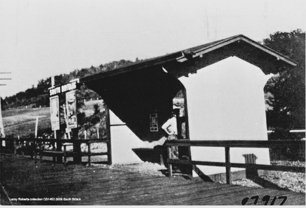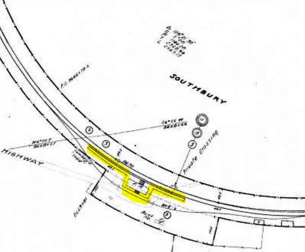 This flag stop in the town of Southbury probably debuted around 1915. It was not on the list of stations when the NY&NE opened the extension to the Hudson River in 1881 and it is neither on their real estate maps for 1886, revised in some cases to 1889, nor on any of the system maps we have from 1889 to 1895. The newspaper in late in 1880 said of the stations in this town that the SOUTHBURY depot had been centrally positioned so as to serve that village, Woodbury and South Britain, but that the inconvenient location chosen "will probably discommode all of them." Rockey, writing in 1892, says the only stops in this town were POMPERAUG VALLEY, aka SOUTHBURY, and SOUTHFORD. The first mention of a depot here in any of the sources is in 1917 as a flag stop and it is still listed as such for four daily trains each way on our 1923 timetable, probably abandoned thereafter with the cutbacks of 1925. We have its location as being just north of I-84 at the Ichabod Rd. overpass. The 1915 val map shows the station standing on the south side of the track. If you look closely at both of these shots, you can see that there is no rear wall in this unusual shelter. Also noteworthy is the paddle mechanism that was raised to notify the train that there was a passenger waiting. [REFS: DN/11/24/1880/??; DN/12/01/1880/??; DN/07/27/1881/01; PTH418.1907.??: no; PTH1917: yes; D139; R2.782]