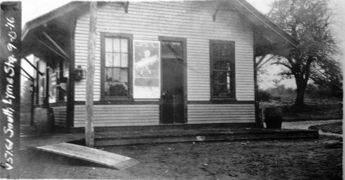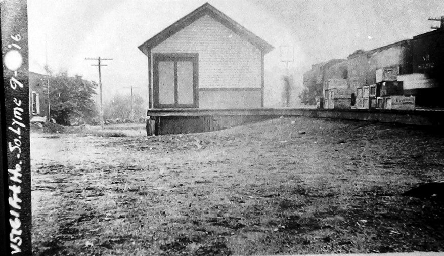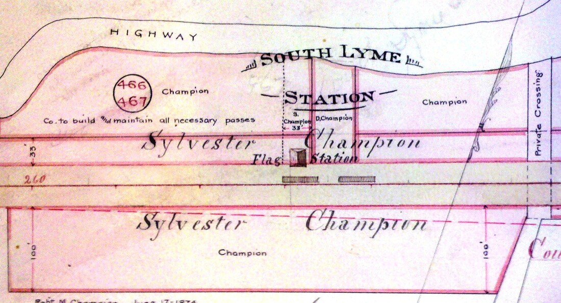 This station was in the town of Old Lyme and appears to have been established when the line was opened in 1852 by the NH&NL. We think the diminutive building in the center of [1] was the first depot here. A locomotive, steam blasting skyward, and a box car are fairly visible in this poor quality image, the best we have, likely taken at a time when this structure was in use as the freight house after its successor was built in 1895. The view looks south at the depot which stood north of the track. To the left is the Carrier general store with the post office located therein at that time. The Carrier name looms large on the Index Map at [2] which likely dates to 1872. The footprint of the structure, perhaps 16x20 feet, and the perpendicular orientation to the track seem to be corroborated. The 9/8/1916 photo at [4], the day verified in the next listing, shows the building now definitely turned parallel to the track and a platform loaded with freight. The end-of-season date may have something to do with that amount of shipping from here. The 1855 Colton map at [3] shows that this station was established at least by then. The history of the Lymes is somewhat convoluted but the towns we know today as Lyme, Old Lyme and East Lyme were all once part of the East Saybrook Plantation and were gradually split off. The confusion of names reached a comic point as reflected in an 1872 article that said when an office boy in town was "... sorting the packages to be mailed, he came across Lyme, East Lyme, North Lyme, South Lyme, Old Lyme and two or three other Lymes, he thought the next Lyme should be Slack Lyme." [REFS: Geer's Express Directory, 1858: yes; NA/11/15/1872/03; NHER/11/22/1878/04][rev012022]