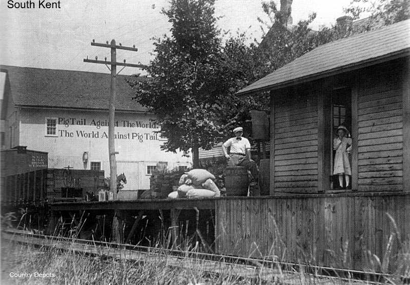 The 'pigtail' reference on the building behind the station goes back to the names this area was known by, including Hopson Corners, Pigtail Corners, and Bulls Bridge. Legend has it that the porcine name, favored by locals, came from an incident in which one feuding neighbor cut the tail off the pig of his enemy. Alternately, the name may have come from the irregular layout of the intersecting Bulls Bridge Rd. and today's Rte. 7. Regardless, the nearby South Kent School has used the 'against the world' rallying call and the student newspaper is The Pigtail even today [click here]. This station would subsequently be named LILY LAKE in 1913 and finally WOODROW the next year, due to a wreck in 1913 at NORTH KENT. The renaming was at the suggestion of the Public Utilities Commission, which said that too many KENT stations may have confused the engineer and caused the accident. According to Pete McLachlan, retired NYNH&H engineer, historian and photographer, the Lily name derived from the family who once owned nearby Hatch Pond. The LILY LAKE name, unpopular with local residents, would be changed to WOODROW with the printing of the next timetable (6/29/1914rev) in honor of the recently elected President Wilson. Interestingly, the Times reported that town of Kent in its entirety had voted for William Howard Taft over Wilson 94-86 in the 1912 election. The gentleman thumbing his nose is said to be Irving N. Drake who acted as chauffeur to famed railroad-station photographer Lewis H. Benton in the 1930s and the handwritten captioning at the bottom is Benton's style. While some have conjectured that Drake is showing displeasure at the renaming of this station, the name of which is not even visible here, it is more widely thought that the pair has gotten the bum's rush from the station agent. According to an online posting, the NHRR was allowed to close WOODROW in 1946 on condition that it stop trains when classes at South Kent School recessed or reconvened. [REFS: HDC/04/28/1859/02: Pigtail; CWN/12/27/1872/02; NYT/12/21/1913/01; HC/12/ 21/1913/21; D71][rev041614]