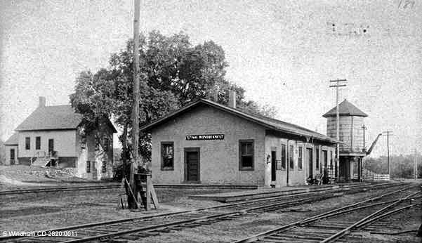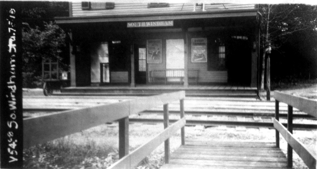 The southern part of the town of Windham would have two railroads and two depots within a few years of the opening of the NLW&P in 1849. The photo at upper left appears in Woodward who says that the shot is ca. 1883 and that this 72x30-ft brick combination station with portico was authorized by the directors on 11/16/1849 and built by the end of that year. The middle picture with the water tank looks ca. 1900. The portico has come down and the wood shed beyond the station has also been removed. The captioning on the photo at right makes it a Lewis H. Benton 1930s shot, though that is not Drake posing and the touring car is not in sight either. Woodward also says this location was known as Spaffordsville. The map shows this depot highlighted at the left. The one at the right SOUTH WINDHAM2, the station for the HP&F, which had become the NY&NE by the time of this 1893 map. [REFS: R92; W32f][rev041713]