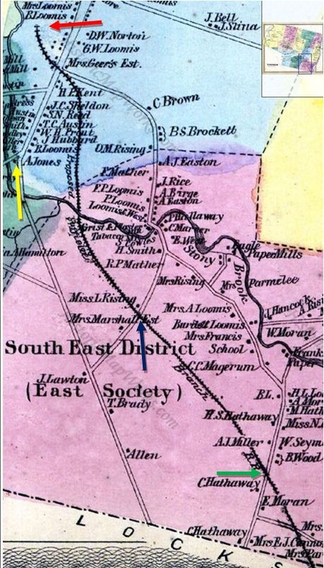According to an article in the Springfield Republican, this as well as BOSTON NECK (purple arrow) and WOODS (green arrow) were original stops on the branch that opened to SUFFIELD (red arrow) on 12/12/1870, all in the town of the latter name. The 1869 Baker and Tilden map at left shows the proposed line the year before it was built by Windsor Locks and Suffield RR. It had the backing of H&NH and a contribution of $25,000 from Suffield, an investment the town never regretted according to one history. This was catch-up for a Suffield after it rejected the railroad in 1844 and forced the H&S to go across the Connecticut River from Windsor Locks to Enfield. As built, the WL&S line swung more to the west so that the SOUTH STREET1 stop was at the yellow arrow. Judging by the tenor of the article in our next entry, there may have only been a platform here, if even that, until the "long-sought station" arrived in 1890. It is hard to imagine that the H&NH provided no facility here for 20 years so we have retained this listing to account for this stop. [REFS: SR/12/12/1870/08; Memorial History of Hartford County, p407][rev111914]