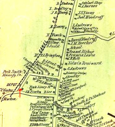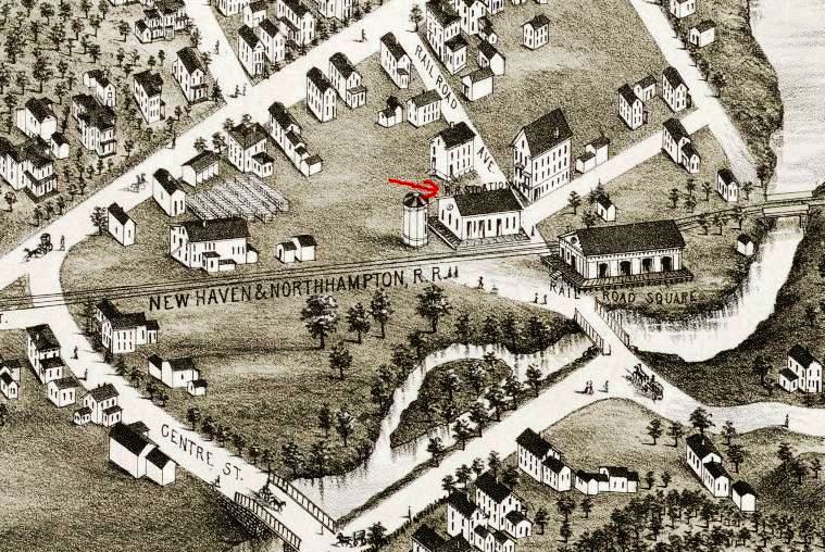 The location is seen to be the same on the 1855HC map at left and on the 1868 Beers map at middle. The image at right is from the Bailey 1878 bird's-eye map and shows the approximate location of the first depot at the red X and the site of the successor station at the red arrow. Inasmuch as Bailey was sketching the town only a few years after the first station was abandoned, it is very likely that it is one of the buildings adjacent to the red X, in the block between High and Centre Sts.