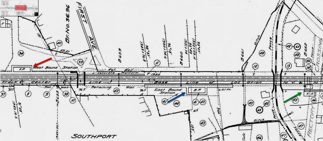 Property for this station on the westbound side of the tracks was purchased in 1890. Interestingly, as our U.K. colleague Jim Fergusson [click here] pointed out recently, there is an unusually large distance, 800 feet, between the eastbound and westbound stations, and the freight house is yet again as far in the opposite direction. All we can surmise is the lack of available property to accommodate a closer arrangement. SOUTHPORT3 was completed as part of the four-tracking project that opened from East Norwalk to "the Fairfield quarries" on 2/21/1892. Though John Roy gives it a date range from 1875 to 1899, we think 1891 is a safe bet. The station received an NRHP designation in 1989 as well. Damaged by fire on 1/4/2008 as seen at [4], it has been refurbished and still stands as one of the remaining saltbox-style stations on the New Haven line. The 1915 val map at [3] shows this [FP=frame (wooden) passenger] station at the red arrow, SOUTHPORT2 [BP=Brick Passenger] at the blue arrow and the [FF=frame (wooden)] freight house at the green arrow. [REFS: R93][rev030515]