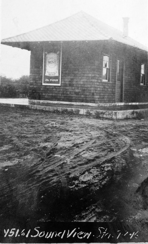 The 1912 season got off to a historic start when the newspaper said... "The first and most pleasing sight which reaches the eye of the arriving cottage owners is the new railroad station, situated on the other side [i.e. north] of the track, and opposite the old one. Although the grading and other preparations were started early last season, the building was not started until after all the cottagers had left. Tickets will now be sold here, a privilege which patrons up to this time had not enjoyed." In what appears to be a matched set, the image at [1] looks east and [2] looks west. You can almost feel the excitement at train time! The marked-up val map at [3] shows the location in more detail; Armstrong's Crossing is today's Cross Lane. Seasonal traffic began on Memorial Day and ended on Labor Day, more or less. A 1920 article makes it sound like the railroad based the station closings on a case by case basis; this one was already closed by 9/16 and Agent Harris was going to CRESCENT BEACH [see there] "until the visitors at that resort depart for their homes, probably another month." The image at [4] is a 10/17/1929 PUC shot which looks compass south but is noted as west for the Shore Line's railroad direction. At left it shows a set of stairs leading up to the platform on the north side of the track. With the Great Depression's impact on the prosperity of vacationers, these beach resort communities shrank in numbers and seasonal profitability for the railroad. The PUC heard a petition on 11/28/1932 at SOUND VIEW station on its proposed abandonment. In November, of course, perhaps according to railroad plan, year-round residents were not numerous enough to stave off the inevitable. Our 2/8/1932TT still lists SOUND VIEW but with no trains stopping there; the last season of service was likely 1931. The fate of the neat little station is unknown to us. It is not on the 1938 SSRR list and our assumption is therefore that it had been disposed of before that time. This stop wound up being more important to the railroad than just for passenger revenue. It was a convenient location with more available land for sidings than where it stood previously at SOUTH LYME2, a mile or so east, and thus a new tower was put into service here on 4/11/1917, the S.S. 106 designation being transferred. This was a more modern type of tower, larger, with more windows and a bay overhanging the track. The new tower is seen at [5] with an I-5 pulling a train likely during World War II. These locomotives were in use from 1937 to until about 1952, according to Charlie Dunn, and this was very busy spot during the war years with freights taking the siding here. The tower lasted until 1960, according to Bill Sample's NHRHTA list. The snippet at [6] shows the depot and tower locations on our Track 11 Google Earth map. The val photo at [7] is dated 9/8/1916 like ones taken at other nearby sites for ICC valuation purposes. [REFS: NHAR41.1912.10; HC/07/03/1912/19; NLD/03/10/1917/08; NMB/04/16/1917/06; NBU/09/16/1920/05; NBU/05/31/1921/05; NBU/06/02/1922/05; HC/10/20/1932/22; Status of Structures to be Retired and Removed, 1938: no; PC transfer of assets, 1/1/1969: no][rev100118, 012122]