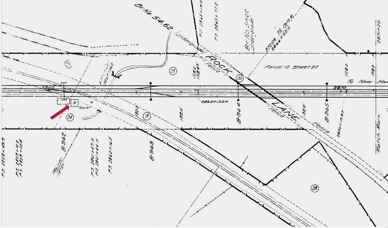 The railroad commissioners report that a new depot was built here in 1895. This structure was located just to the west of the first station. Surpisingly no newspaper articles have been found. The undated view at [1] is taken from a circa 1907 postcard. The 1893 topo map at [2] shows the location. The ICC valuation photo at [3] is dated 9/8/1916. The val map at [4] shows the layout in August, 1925, marked up for a real estate transaction. The original maps date to 6/30/1915 and were subsequently used by the railroad for property management purposes. The private under-crossing eventually became today's Shore Acres Rd. after the Point O' Woods resort community was developed in 1918. Note that the station platform seems to extend to the end of the overpass bridge. The image at [5] is Lewis H. Benton's #2389 taken in June, 1929. Fellow photographer and duo 'chauffeur' Irving N. Drake is standing by his sedan, the vehicle second from right. We also note that the sign on the depot says the post office was here at that time. The rare view at [6] shows the 1893 South Lyme signal tower which was replaced in 1917 by a more modern structure at Sound View, a mile or so west, the S.S. 106 designation transferred there. The passenger station depot reportedly closed permanently in 1927. It stood at least until 1938 when the SSRR list says it was being leased for $204 per year and the freight house was rented as well. Further fate is yet unknown to us. Al Weaver's masterful superimposition at [7] tells the whole story here, with the 1915 val map [left] and the 1934 aerial [right] shown on today's map. We have added the red arrow to show the location of S.S. 106 before it was moved to SOUND VIEW. [REFS: CRC43.1895.13; NMB/04/16/1917/06; Status of Stations to be Retired and Removed, 1938: yes, leased; HC/07/08/1970/30F][rev010518; 012122]