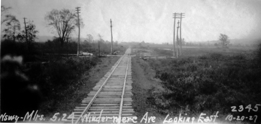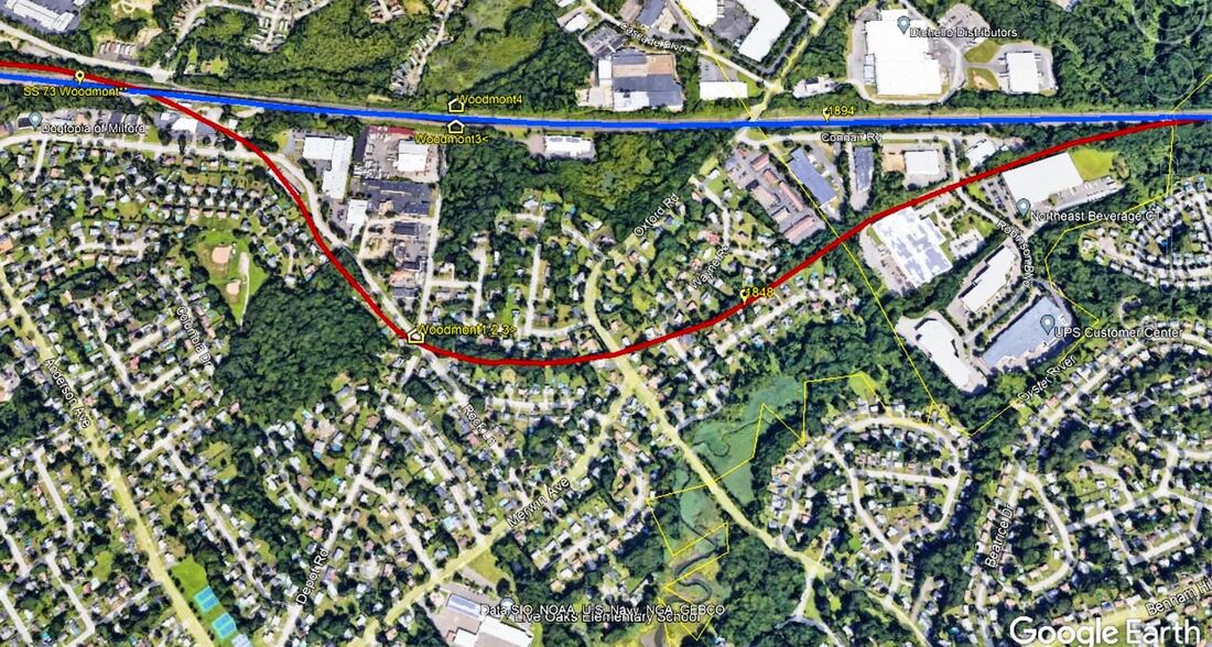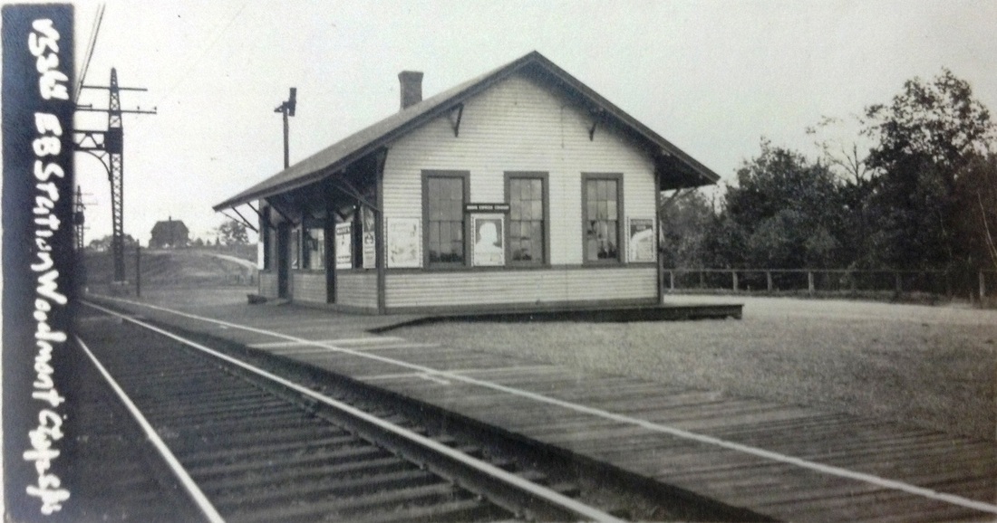 Apparently this depot was already built at the old location, and perhaps briefly in service there, but moved to the the new alignment slightly to the north. The Register reported on 5/20/1894 that, while one gang of men was taking up rail from the abandoned right of way, another gang "loaded the Woodmont depot, chimney and all, upon flat cars. Two locomotives then drew the depot down to the junction with the new main line and then pushed it back midway in the new cut where it was unloaded and the passengers received just as usual. Still another gang loaded the signal tower on a flat car, and by noon that was in operation in the new cut. The 4:22 express thundered over the new rails at high speed and the gliding of the cars was as smooth as over any bit of track on the line of the road." The paper went on to say that everything had been done to perfection and that the work here had cost a seemingly high $2,000,000. How easily the station was initially accessed in the new location is unclear because Depot Rd. was not finished until June, 1895. The val photo at [1] is dated 10/25/1916. The 6/30/1915 val map at [2] shows the layout of the station grounds, with the larger WOODMONT3 on the south, eastbound side, in contrast to most other locations. The view at [3] looks west with the row of beautiful steel catenary looking like goes on forever. Shades of the mirror scene in Citizen Kane! This depot was razed in the spring of 1929, as the Courant reported in November, with service discontinued almost two years earlier on 6/11/1927. At the hearing on 11/13/1929, a legal formality that had to precede the abandonment of any stop in existence over a year, the railroad justified its actions with the claim that traffic had dwindled toward the end to two riders per day. Though local residents protested and the decision was reserved, C.C. Elwell of the PUC said "prospects of continuing the station did not look very promising." Our 11/18/1928TT shows no stop here any more. [REFS: RRC32.23 (12/31/92); HC/12/28/1892/06; NHER/05/21/1894/01; NHJC/08/22/1894/02; CRC42.1894.17; NHER/06/24/1895/08; HC/10/26/1929/09; HC/11/14/1929/12][rev022815, 052422]