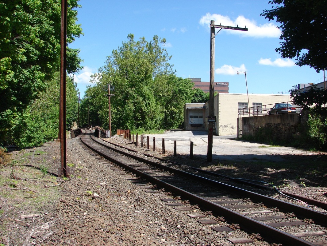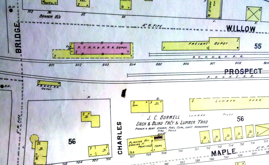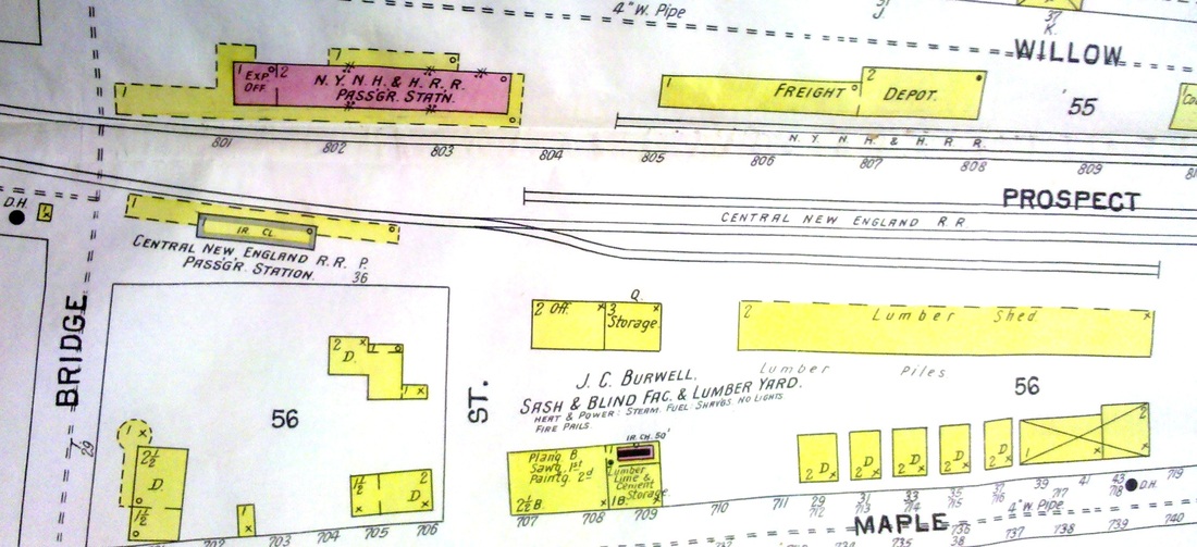 Currently about to begin construction at 231 Main St., just north of WINDSOR LOCKS3, the plan being to replace the minimal AM-shack down at I-91. The Track 11 Google Earth map snippet shows the locations of four of the five stations. Windsor Locks almost got another railroad and station in 1902 when the CNE, thwarted in East Granby from going to Springfield, considered building the Windsor Locks RR, either as an alternative route to Massachusetts or as a stub-end branch to drain some of the industrial traffic that the NYNH&H was monopolizing. Several newspaper articles tell of land acquisitions to bring the new line into town. The terminus was to be at Chestnut St., seen on 1913 map snippet [1] in the previous entry, and the area to the west corresponding to today's Pesci Park was to be the site for the CNE facilities. The red line coming in from the left on is the terminus of the never-built Windsor Locks RR.