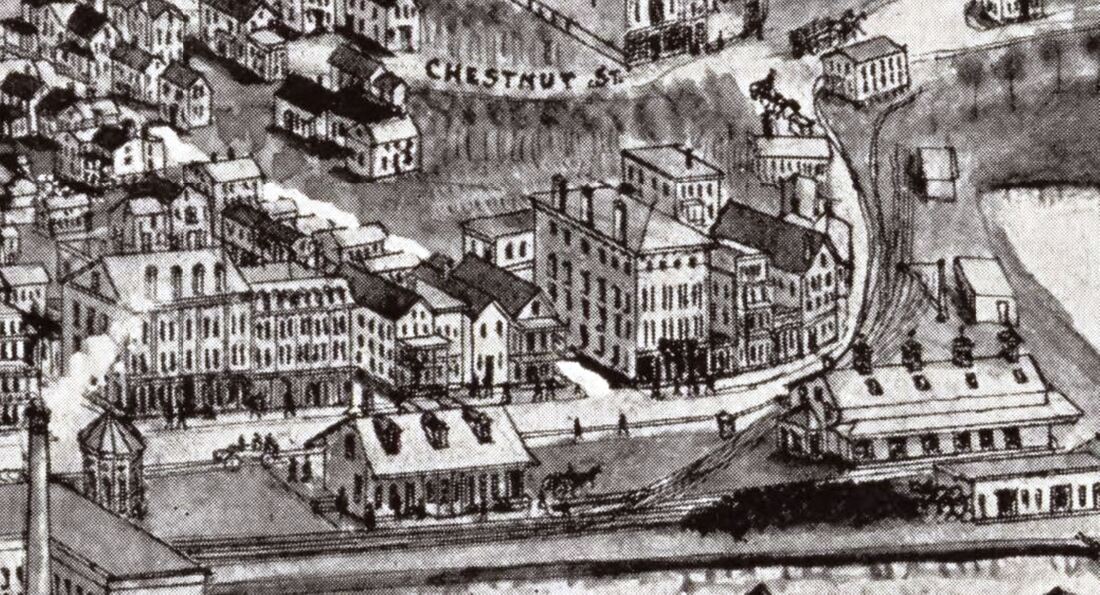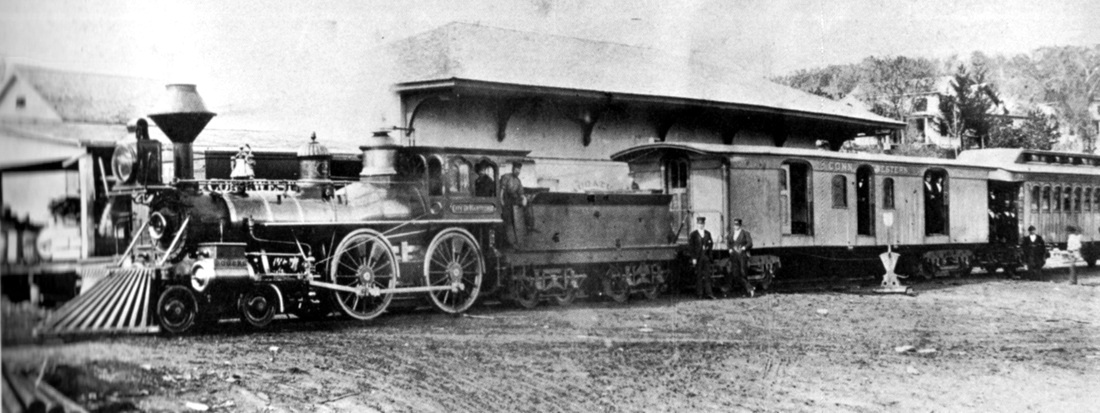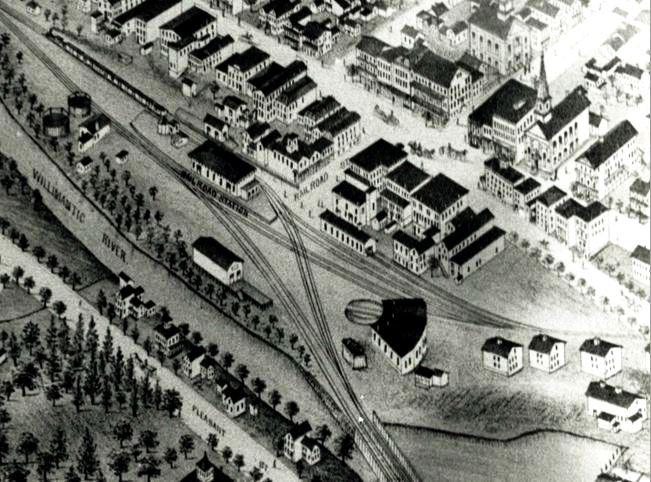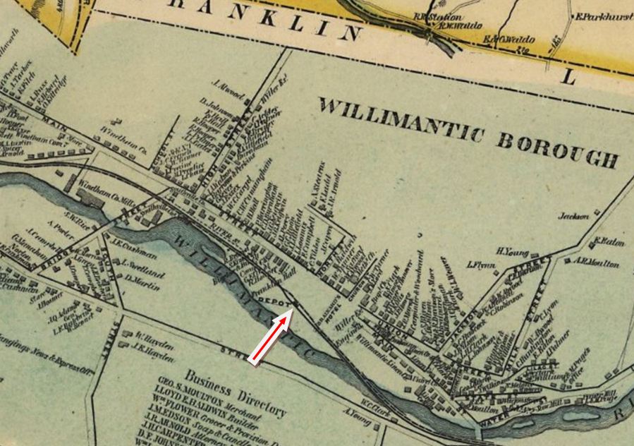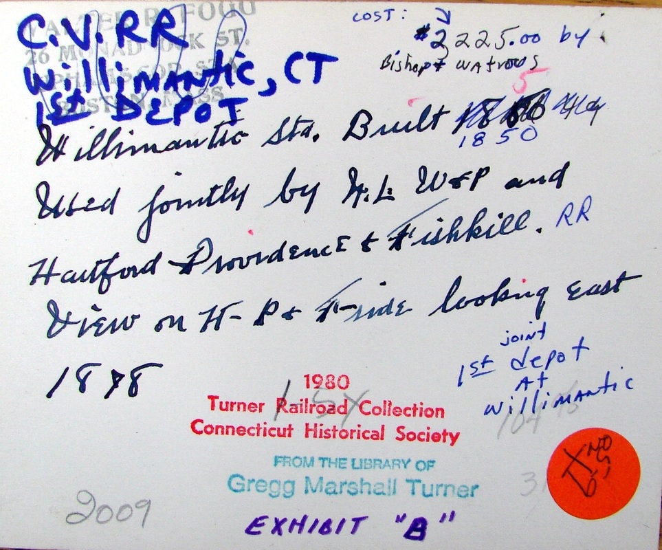 The reverse side of the singularly unique and rare CHS photo at [1] identifies the station as the first in the Thread City. No other images of this depot have been found thus far. The photograph was once in the collection of the late Walter Fogg who generously shared material with us back in the 1970s. The reverse side at [2] shows black-ink writing that looks to be the oldest and later ballpoint and marker revisions. Regular NLW&P service began for this city on 11/19/1849 and HP&F timetable trains debuted on 11/26/1849, a scant week later. The corrected build date of 1850 and the cost of $2,225 have been independently corroborated in our research. Further verification shows that the Willimantic depot was already up by January, 1850. A gala NL&WP excursion from New London on 1/10/1850 departed at 7:00 p.m. and "... reached the depot at Willimantic at precisely eight...." According to the notations, the 1878 view at [1] looks east along the HP&F track that ran on the north side of the station; the NLW&P came in on the south side. By the time of the photo, the HP&F had evolved into the NY&NE, the NLW&P had become the NLN, and the B&NYAL was also bringing trains into this station on the Air Line that opened in 1873. This depot stood between tracks, as seen on the 1856WC map at [3] and on the 1876 Bailey bird's-eye map at [4]. By 1882, there were increased calls for a newer, safer arrangement. Conditions here had been decried all the way back to 1855 in the second annual report of the railroad commissioners. They were still counseling patience to the legislature 10 years later, and themselves finally complained that "after waiting in vain seventeen years for the 'maturity' of these plans," nothing yet had been done. In "The Willimantic Depot" opinion piece, the Courant said: "The rapid growth of Willimantic, the recent development of the New England road into a trunk line, and the general increase of railroad business through the state have combined to make the present Willimantic railway depot utterly unfit for its purposes. It is surrounded by tracks, cars are almost constantly moving past it. To approach it is to walk into danger. Every day sees narrow escapes there, and only recently a well known gentleman was run over and cut to pieces there." [REFS: HDC/11/16/1849/02; SR/11/28/1849/02; NLDC/01/12/1850/02; HC/01/05/1852/02; CRC12. 1865.8; CRC24.1877 .20: remodeled; HDC/04/25/1882/02; CRC30 .1883.25; W31][rev041922]