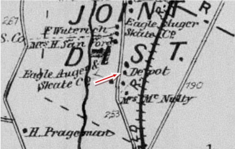 According to Adams, the CW put a box car body here in 1880 in the narrow space between its track and Depot St. to comply with the order that its trains stop opposite the NRR station at Bridge St. The 1880 NY&NE appraisal of CW properties said this structure was worth a mere $200, thus validating Adams claim. The earliest map we could find to reflect this is the one at upper left from 1893. It shows the NRR depot as 'Winsted station' and the 'Naugatuck Depot' of the then PR&NE to the south. The 1896 map at upper right reiterates this arrangement and the 1897 map at lower left shows the small footprint of the box car. When TARIFFVILLE1 burned down in 1892, the Winsted Citizen wrote the following requiem: "The Tariffville railroad station burned the other night. It was the meanest, shabbiest, dirtiest and most disgraceful hog pen on the road between Hartford and Poughkeepsie through courtesy known as an alleged railroad station, excepting, of course, the ancient old ark on the flat." That hometown "ark" was this depot which sat in the central low-lying part of the borough known as the flat. In April, 1896 a Herald article mentions repairs being made to the platform at the PR&NE station. The Courant reported late in 1897 that "the 'cheese box' depot on the Flat" that was "squatty, unsightly and uncomfortable" was being torn down and a new one was going to be erected immediately to the east. PR&NE tickets were, meanwhile, to be sold at the NRR station. We have no photo of the structure that was so reviled. [REFS: WC/10/01/1890/00; WC/05/06/1892/00; WC/09/00/1895/00; WH/04/15/1896/08; WEC/12/10/1898/00; HDC/12/14/1897/11; HDC/12/22/1897/12][rev020518]