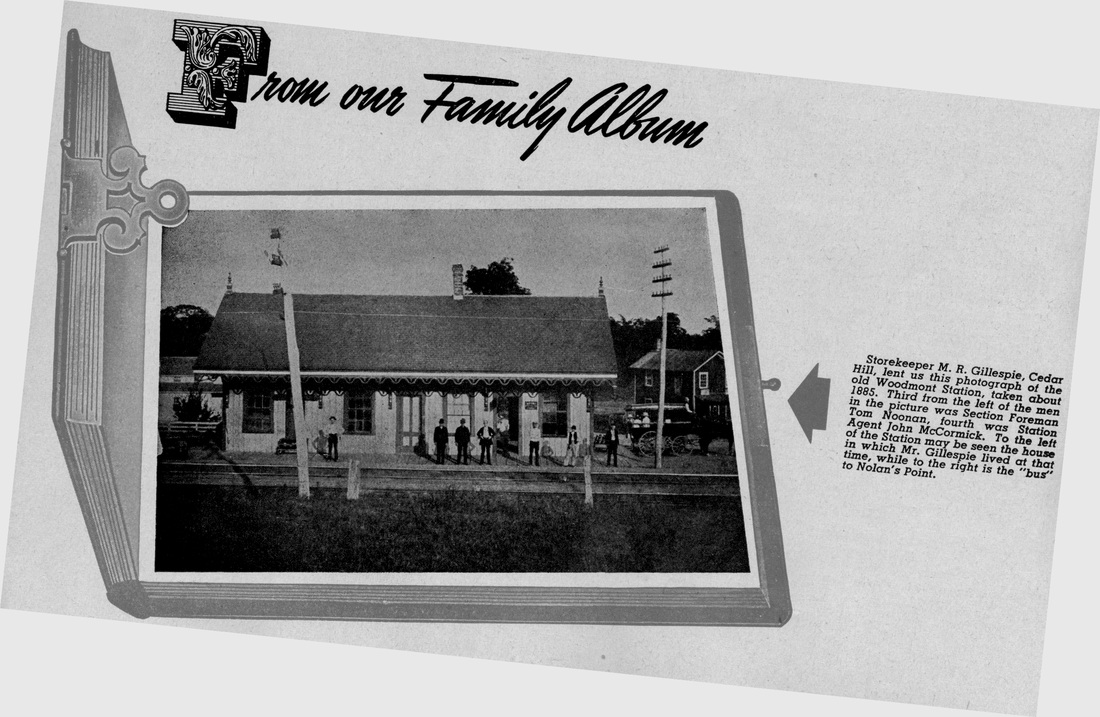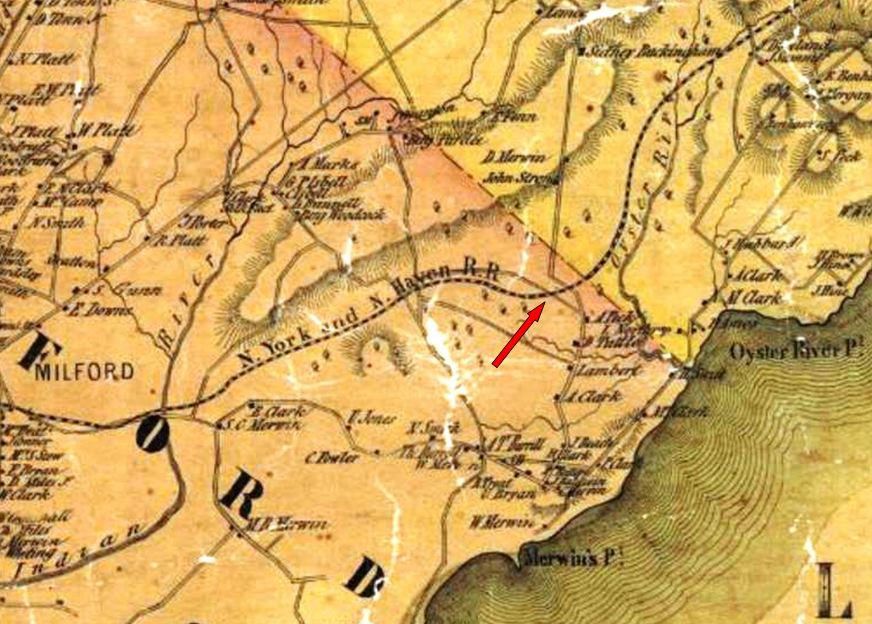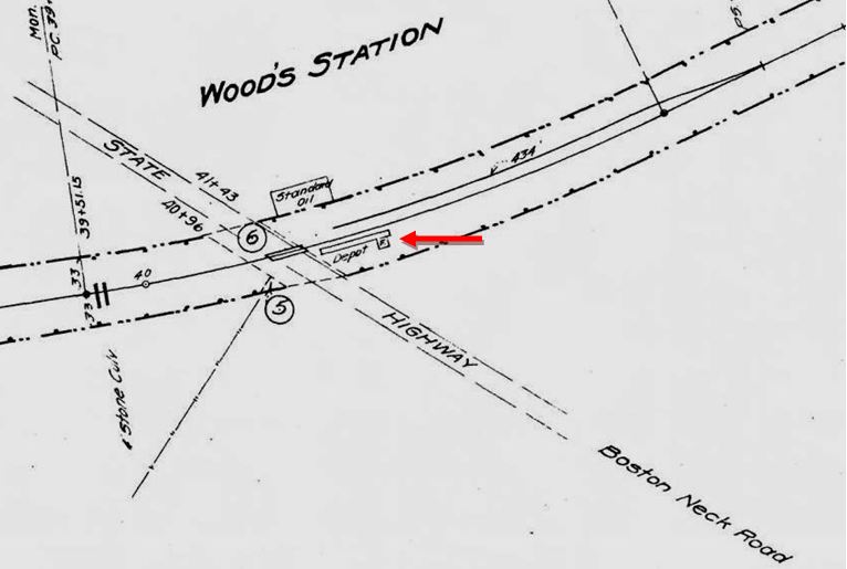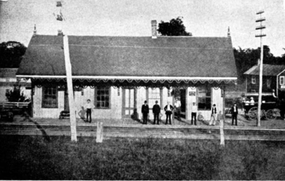 This stop in the town of Milford was established in 1874. The Register tells us that the 20x50-ft structure "... was erected by citizens residing at Merwin's Point, Oyster River and Bunnell's Farms, and on Saturday evening last [1/24/1874] the subscribers met at the depot, and decided to call the station 'Woodmont'...," after a wooded slope near the stop. It cost "... a trifle over $2,000...." At the same time a petition was sent to the postmaster general and the Woodmont post office located in the depot began operation on 3/3/1874 with James R. Ayres as postmaster. The Register first reported on 2/11/1874 that trains were now stopping here. The depot was substantial for a fledgling stop. It is seen ca. 1885 in the image at [1]. The arrow on the 1852NH map at [2] shows the location. Courtesy of Richard Fleischer, the August/September, 1946 Along the Line issue at [3] identifies the man in the doorway as Station Agent John McCormick and left of him, hands on hips, is Section Foreman John Noonan. WOODMONT began as a flag stop but with the shore just 10 minutes away, this area would grow quickly as a summer resort. By 1883 at least, this appears to have become a timetable stop. A short-lived demotion back to flag stop and a refusal by the company to continue to handle less-than-carload freight in 1887, with 19 trains per day reportedly stopping here, had local farmers "up in arms,"... ready to go to TYLER CITY and patronize the NH&D. The Consolidated quickly came to its senses. This ill-timed move was even more surprising since the Derby road was about to be leased by the HRR and the battle for customers would commence, with the NYNH&H threatening to build the link that its newly acquired NRR had planned earlier from WHEELERS FARM -- think Sikorsky Bridge and Wilbur Cross Parkway -- to here. WOODMONT1 would burn on 10/17/1890 shortly after 10:00 in the morning, with the Register saying that nothing remained "but a heap of smoldering ruins." Though the loss was said to be relatively minor, "as the station was a small one-story affair of wood and the damage will not exceed $2,000" and it was fully insured. According to other sources, the building had contained a waiting room, a baggage room, the post office, and the Western Union telegraph office. The fire was thought to have been caused by a defective chimney flue and it resisted the efforts of twenty men to save it. By November, the Courant reported that a passenger car was being used as a waiting room and a freight car was in service for baggage, and presumably freight purposes as well. [REFS: NHDP/07/23/1873/04; WHJ/12/01/1873/02; CRC21.1874.18; NHDP/01/27/1874/04; NHER/01/31/ 1874/03; WH/02/13/1874/03; Post office: Warmsley p245 (3/3/1874): NHDP/06/11/1878/04; NHER/06/27/1887/01; NHER/06/28/1887/04; NHER/07/27/1887/01; NHER/08/18/1890/01; NHER/10/17/ 1890/01; HC/10/18/1890/08; HC/11/26/1890/06; RRC32.23 (12/24/1892); RRC32.30 (12/31/1892); NHER /08/28/1895/01 [rev030415, 052422]