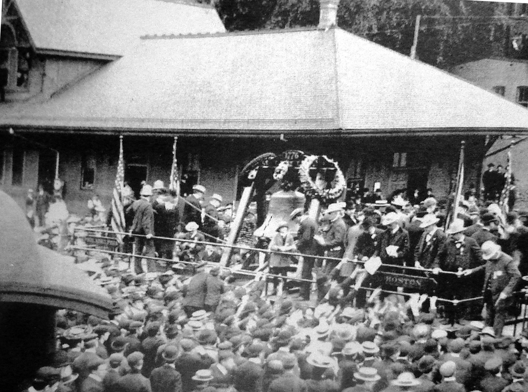 Complaints about the dangers here set Willimantic up as a poster child for depot safety issues, a direct result of which was a legislative bill to give the railroad commissioners the power to compel the railroads to relocate stations and to cooperate in union station projects where needed. The measure passed the house but "was amended into nothing" in the state senate, where it was reportedly stymied by the NLN president who was a senator on the committee considering the bill! His road "objects to changing," according to the Courant. Apparently the NY&NE then took the initiative and the railroad commissioners spoke of the new depot in January of 1884. Blueprints from the Peters Railroad Museum are now at UConn. Dated 6/2/1883, they bear this parentage and timing out and the NY&NE annual report in December stated that the company had erected "a commodious Union Passenger Station, at a cost to date of $8506.38. It was opened for the use of the Public on the 19th of November." As far away as Canaan, the Connecticut Western News reported that it was a 130x32-ft wooden structure with a slate roof. The val photo at [1] shows the station in 1916 still sporting the stick-bracketed dormer that was later removed, reportedly after the hurricane of 1938. The shot at [2] captures the station hosting the Liberty Bell on 6/16/1903, when the Revolutionary War relic was on its way to Boston to mark the 128th anniversary of the Battle of Bunker Hill. The NY&NE real estate map at [3] shows the grounds in 1891 and it also indicates a baggage building just west of the 1883 station. Heavy passenger traffic here created a need for more space as early as 1889 when the newspaper said a "commodious structure 25x40 feet, to be used as the baggage room" was going up, with the vacated space in the station going for expanded Western Union quarters. This baggage building is seen in the aero view [click here] at [4], flanked by wings for further expansion by that time. This rather grand, composite structure is seen at [5]. As early as 1909 there were calls for the NYNH&H to build a newer passenger station "considering the fact that more than $100,000.00 worth of tickets are sold at the depot here every year," but WILLIMANTIC2 would endure until 1955. At that time, downtown businesses were booming and the city was looking for more automobile parking. The PUC approved the transfer of the station parcel early in 1955 as part of a plan for the railroad to build a smaller passenger depot west of Bridge St. Enter the hurricanes later that year and the resulting severance of the Midland Division at Putnam. The photo at [6] was taken on 10/3/1955 by local resident Clifford A. Heath and shows up on a Christmas card to Frank Ballard Ramsdell whose collection is now at the Thompson Historical Society. Info on the back of the card says the station was torn down on 10/5/1955 but that must have only been the start of the demolition, which the Courant says was still in progress on 10/14/1955. City planners now admit this was an unfortunate choice; no new passenger stop would exist until almost 40 years later, coincidentally at the intended Bridge St. location. The 11/12/2012 photo at [7] caught a New England Central locomotive jockeying cars beneath the 1906 pedestrian walkway, the ultimate solution to the safety problems here. It reportedly was the first such structure in the country to traverse roadway, sidewalk, railway and river. The walkway was given an NRHP designation in 1979. [REFS: HDC/04/25/1882/02; HDC/01/15/1883/02; CWN/06/06/1883/03; TVH/12/13/1883/??; NYNEAR8 .1883.17; CRC31.1884.19; HDC/02/15/1889/06; HC/01/26/1896/09; HC/08/25/1896/06; HC/02/16/1905/02; HC/10/09/1909/13; HC/08/16/1952/8A; HC/02 /02/1955/19B; HC/10/14/1955/30B; HC/12/13/1955/A13B: lost ref; HC/12/17/1955/6B; K113][rev123016, rrd032622]