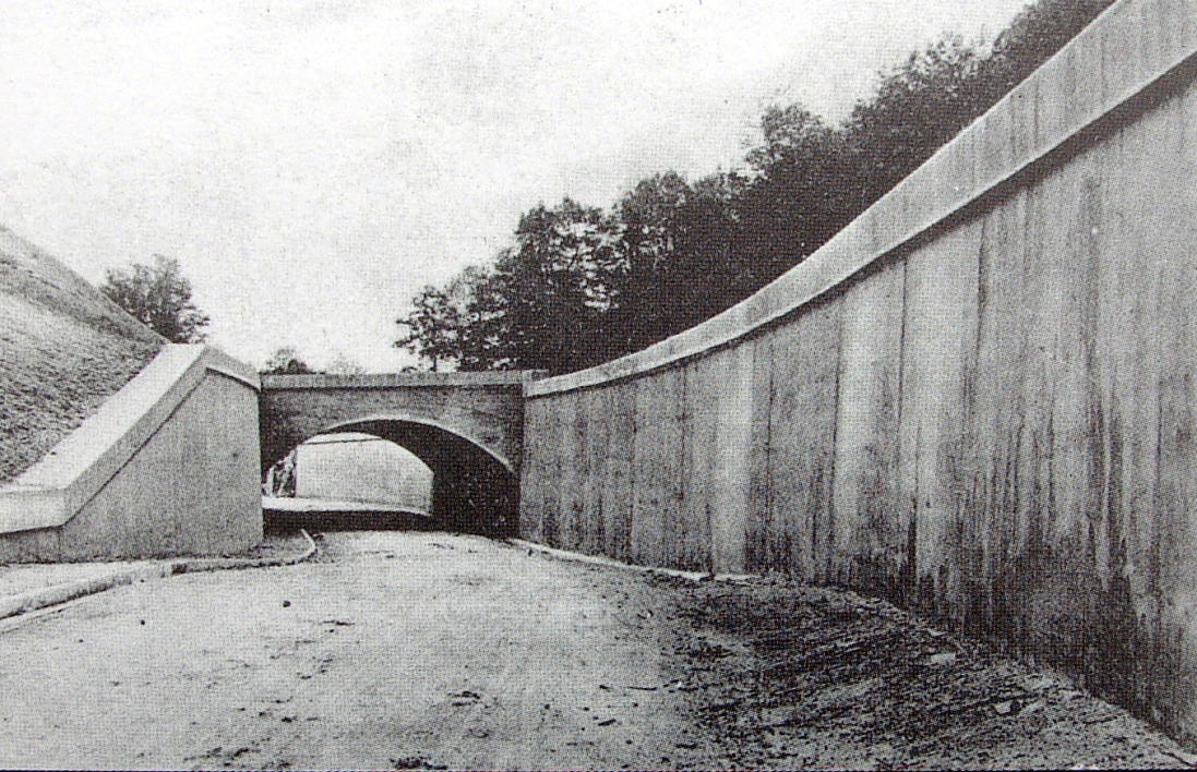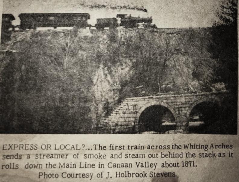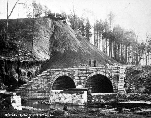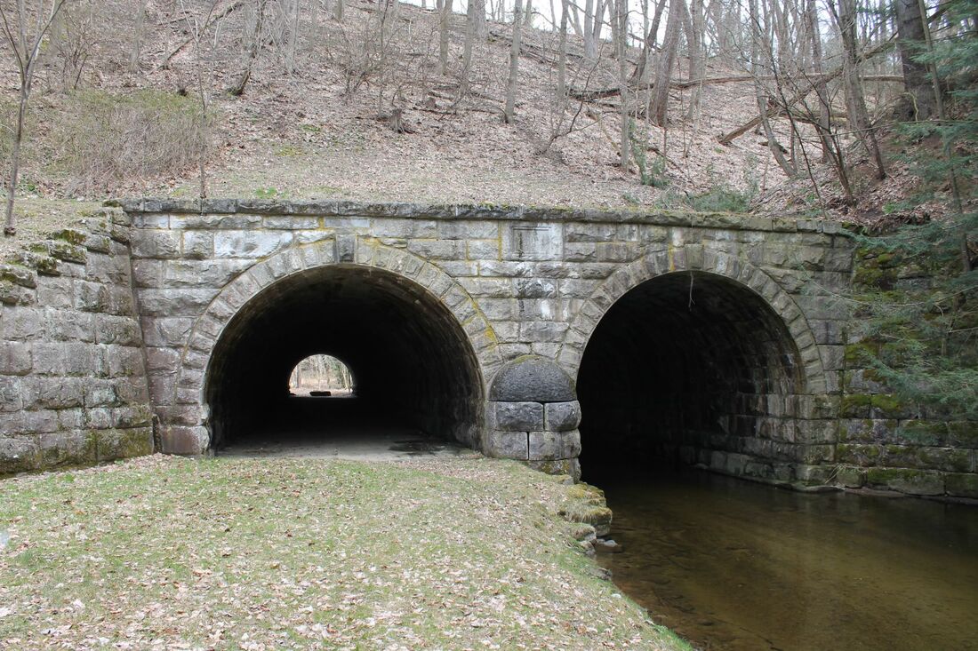 This name of this stop in the present town of North Canaan appeared as such on an 1871 pre-opening list of stations in the newspaper but the name CANAAN VALLEY was used officially by the CW until about 1882 when the line was reorganized as the H&CW and the name was changed back. The shot at [1] looks east past the small milk depot, also apparently used by passengers. Nimke says the milk station was built in 1915 and it was gone by 1938, the same year passenger service was abandoned. Prior to that perhaps this stop only had a platform. The structure is just ahead of the famed Whiting Arches, which are down at the base of the embankment. The shot at [2] shows the arches under construction. The project was already underway in September, 1870 and completed on 1/3/1871 with due ceremony. The last CW rail was laid on 12/7/1871 at Canton. The newspaper clipping at [3] shows the first CW train crossing, likely the inspection train carrying Pres. Barnum, company officials and the railroad commissioners on 12/13/1871. The western arch bridged the Hartford Tpke, today's Rte 44, and the eastern one channeled the Whiting River. The project was undertaken by Alderman Ives & Co. of East Canaan, consisting of Ives, David Starick and Willie A. Barnes. The names are visible to this day on the cornerstone on the south side of the massive masonry structure. Apparently, this was at or near the last hurrah for this partnership which was dissolved on 10/27/1871, Starick, spelled Starrick on the stone, retiring at the time. A 1000-ft cut about 40 feet in depth was necessary to approach the river from the west and the 250,000 square yards of removed debris was used for the 80-ft high, 1000-ft long "great fill" across the river valley. The 206-ft long 'tunnels' are 20 feet high and 20 feet wide. This was always a must-see stop on the CNE tours and endures today as a landmark feat of railroad engineering in the state. Many thanks to railfan Alan Lagocki for the photos at [5] and [6] taken in April, 2020. [REFS: HDC/09/20/1870/04; CC/01/17/1871/04; CWN/12/15/1871/02; HDC/12/15/1871/01; WDA/08/22/1871/03; CWN/10/20/1871/03; HDC/12/14/1871/02; WH/10/25/1872/02; K115; N3.62][rev042113, 052120]