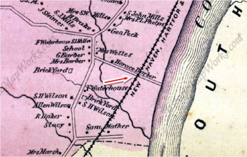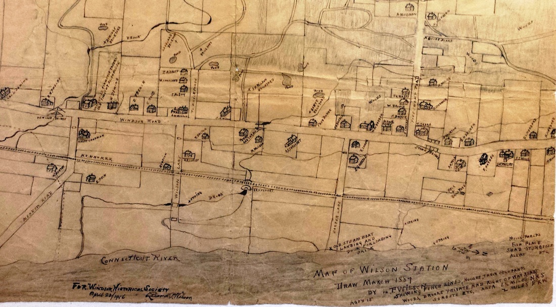 We do not know what the first station at this stop in Windsor just over the Hartford line looked like but a newspaper article, likely the Hartford Times, of August, 1928, said it was built by Allyn, Samuel and Fred Wilson at their own expense as part of a deal to have trains stop here. However valid the builders might be, a Courant article notes the debut in February, 1871. It reads: "Suburban Residences. The new stopping-place on the Hartford and New Haven road, between this city and Windsor... is called 'Wilson's Station,' and is three and one-half miles from the State House... The establishment of such stations in the immediate vicinity of Hartford... and the running of frequent trains at cheap fares is the true way to build up a large local business on the roads, and to promote the public welfare. The fare to the new station is only fifteen cents." This was the era when the railroad actually created places and put them on the map. Hundreds of newspaper articles thereafter reference Wilson Station and the economic and social activity here, undoubtedly stimulated by local rail access. The image at [1] is from the Baker & Tilden atlas of 1869 and shows residences with the Wilson surname for which the locale came to be known, similar to HAYDENS also in WINDSOR. The 1887 map at [2] was hand-drawn by Allyn's cartographically precocious 15-year-old son, Leland P. Wilson, and shows the depot in the southwest quadrant of the Wilson Lane grade crossing, where Wilson Ave. dead-ends today. Nefarious doings here most notably came in an 1891 dynamiting incident. The perpetrator then was a debonair French con man by the name of Amie (=Friend!) Louis Barrand who admitted that he "wanted to have fun with an explosion." His decade-long career of swindle, impersonation and sabotage began in 1879 and on 7/2/1891 he said he planted charges on a culvert south of WILSONS hoping to see the train thrown into the creek. Minor damage and no serious injures resulted and Barrand said then that he "remained about the wreck and enjoyed the excitement" of the frightened passengers with whom he mingled. Shortly thereafter, he got a ten-year prison sentence for blowing a Lehigh Valley engine off the track in Belvidere, NJ. We do not know if he ever faced the wrath of the NYNH&H. [REFS: HDC/02/01/1871/02; HDC/09/01/1871/02; HDC/12/31/ 1881/04; HDC/05/31/1872/02; HDC/07/02/1891/01; SR/07/02/1891/05; HC/09/19/1891/01; HC/10/01/1891/01; HC/08/21/1896/08][rev072816]