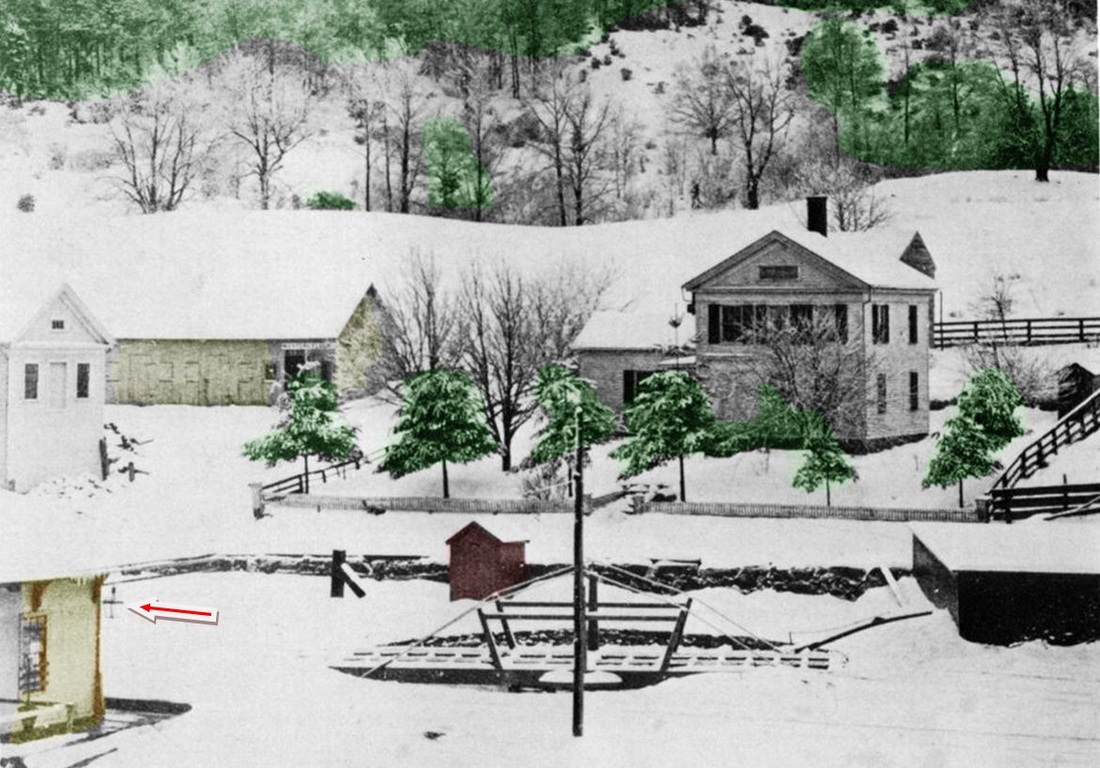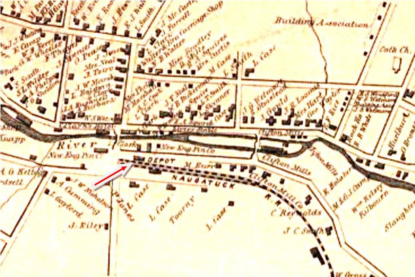 The photo at upper left is misidentified as WEST WINSTED in the book Connecticut Railroads and elsewhere but, in fact, is the NRR's 1849 downtown station. It looks pretty typical of others like DERBY1 and NAUGATUCK1. The middle photo is from Bob Adams's "Winsted's Quintuplets" article and carries the original captioning that refers to "a station with ornate corner lamp." Al Weaver's colorized version at right has helped greatly in showing the building in the left foreground that Adams meant and our red arrow points to the lamp. This photo, often seen without the captioning that is admittedly vague, has understandably added to the confusion. While the downtown depot appears adequate enough, the Winsted Herald railed retrospectively in 1879 that it had been "cussed and discussed" for nigh the 30 years it stood, that it wasn't "fit to put pigs in -- much less passengers" and that, since the depot floor was a step lower than the outside platform, "many an old lady or other unwary passenger pitched headlong into the darkness after alighting from the evening train." The paper went on to blame the avarice of the NRR management for not replacing it sooner. The 1854LC map at lower left shows the location at the corner of Bridge and Depot Sts., in the center of the borough. [REFS: WH/07/25/1879/05; NMRA Bulletin 43.8 (4/1978); C134][rev 031113]