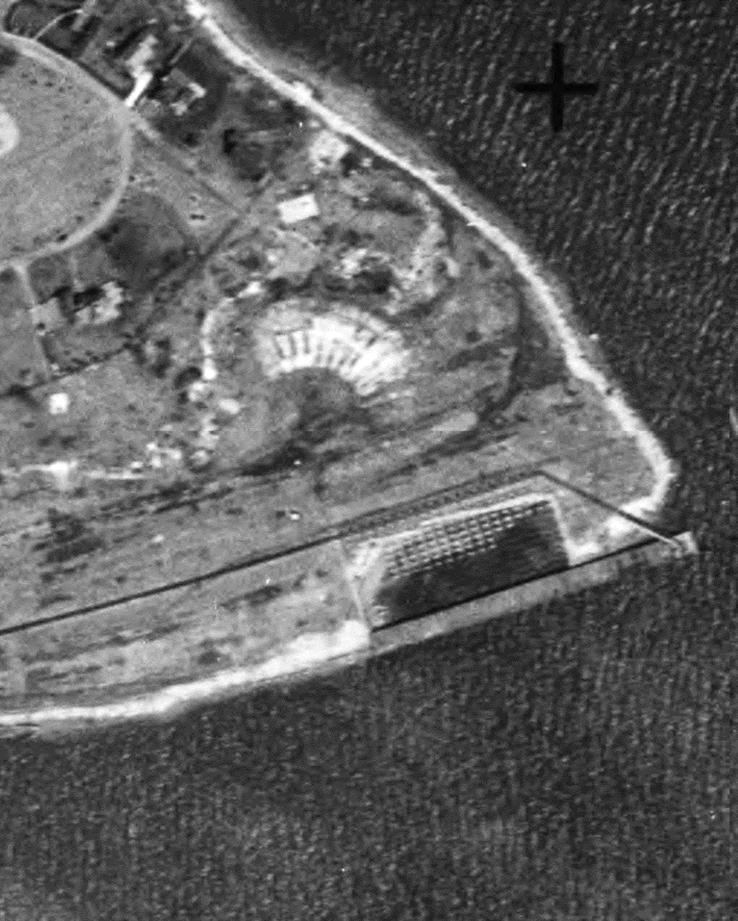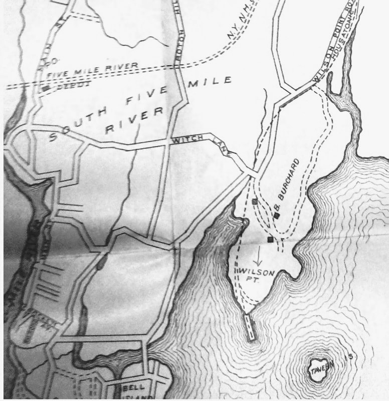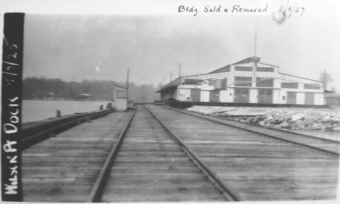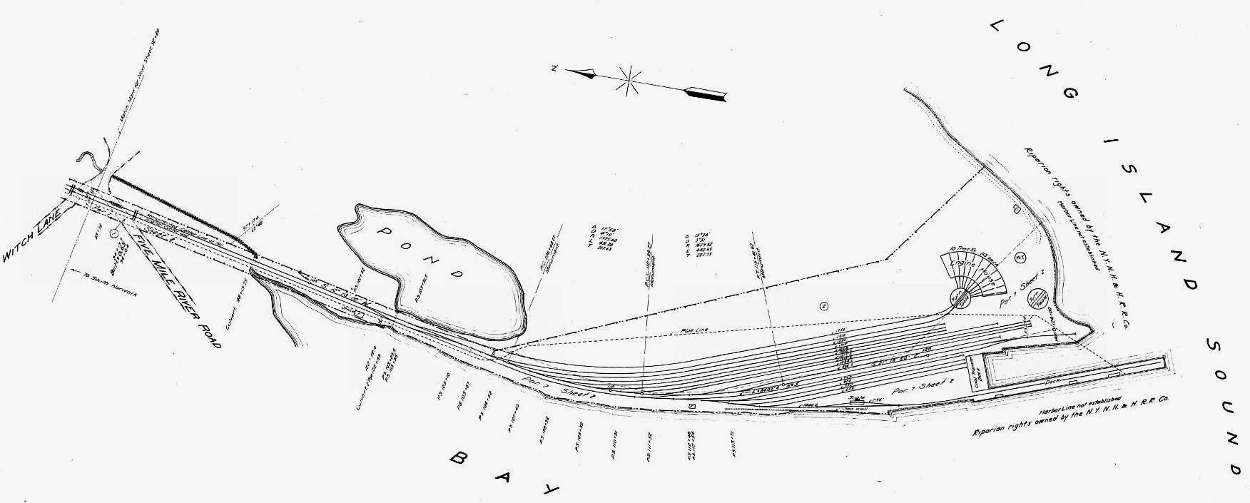 In the wake of the fire, the HRR temporarily transferred the boat operation to Bridgeport and announced its intention to immediately rebuild and expand further at WILSON POINT. A terminal complex with 500-car capacity was the result by the following year, with 24 "heavily-laden cars" sent to New York every night and goods reaching their destination by 7:00 a.m. "... beating all rival carriers." We do not know if the shot at [1] was it or it shows a later structure. The NY&NE/HRR alliance created the New England Terminal Co. to operate boats to Manhattan and to Jersey City for direct connections with the Pennsylvania RR there. New service began on 5/15/1890 and William H. Stevenson, NH&D president and HRR vice president and general manager, lost no time in inviting Connecticut legislators as well as businessmen from Pittsfield, Springfield and Hartford to show them that this was the best way for their goods to travel, running special inspection trains that connected with boats down to Piers 45 and 46 on the East River. The alliance pinned more hopes here on 9/16/1891 with the start of the short-lived Long Island & Eastern States Express line taking trains overnight to Boston from Brooklyn via Oyster Bay, NY and cross-Sound transfer barges. The party was over, however, on 6/10/1892 after J.P. Morgan obtained stock control of the HRR/D&N/NH&D on behalf of the NYNH&H. One of the first announcements was the cancellation of special tariffs via Wilson Point. Passenger service ended thereafter, likely in 1893, according to timetables; the last oblique reference is an August, 1892 newspaper article which noted a party from Bell Island being rowed across the water to "catch the early train" to South Norwalk. With its own facilities at Harlem River, the Consolidated also scaled this back as a freight terminus though newspaper articles show 'Wilson Point freights' and switching activity here until at least 1912. In 1893 this became a Standard Oil terminal with tanks built just to the north and a coal unloading facility was announced in 1905. During WWI the location was used for military and shipbuilding purposes but was still railroad property at the time the 5/2/1925 PUC photo at [1] was taken. The handwritten note at top says the building was sold and removed on 2/9/1927. The footprint on the 1915 val map at [2] appears to match the structure in the photo. The 1934 aerial map at [3] shows the building gone; the outline of the old engine house still may be seen. [REFS: NBE/04/19/1889/02; NHER/07/26/1889/04; NYTR/11/25/1889/02: Express; SAD/02/14/1890/02; NYTR/02/26/1890/12: oyster damage feared from oil; SWP/02/28/1890/01; WSDN/05/16/1890/02; SR/05/25/1890/07; SR/06/04/1890/06; NYT/06/24/1892/03; 11/6/1892PTT: Wilson Point yes; rev7/15/1894PTT: no; WH/08/18/1893/03; NBE/07/20/1894/03: old dock torn down; NHER/12/27/1894/01; NHER/03/06/1896/02: depot burned; DN/06/28/1905/03: new coal facility; BEF/09/04/1912/01; NBU/02/16/1922/01][rev030618]