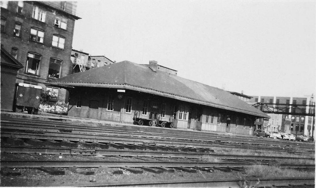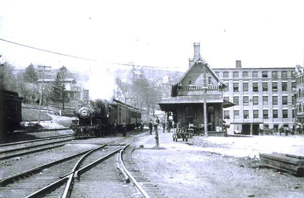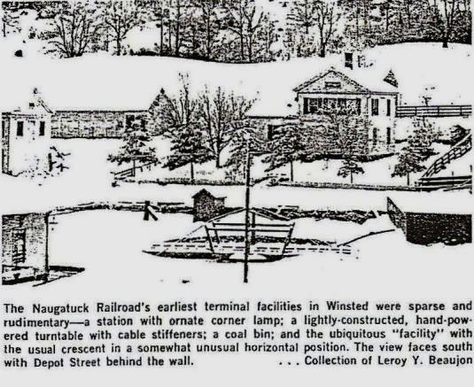 The image at left is from the Bailey bird's-eye map of 1877 [click here]. This NRR depot opened on 12/4/1876. The railroad commissioners described this building in their 1877 annual report as "substantially built of brick, with stone trimmings," having a nine-foot wide covered platform on the south and east sides and a 30x20-ft covered platform on the west end for baggage and express. Inside was a 65-ft-long single waiting room for men and women, "heated by steam and lighted by gas," with ticket office in the center, freight and baggage room on one end (east) and telegraph and express offices on the other (west), the cost of the depot being about $10,000. The Winsted Herald, continuing its 1879 rant, said this station had come, not out of generosity, but because the NRR was compelled by the competition. The NRR, it continued, had the entire Valley by the throat and that in 1879 Wolcottville, aka Torrington, was paying $2.00 more per ton for coal than Winsted which had been rescued from "the rigor of a railroad monopoly" by the coming of the Connecticut Western. In 1905, when all the other Winsted depots were abandoned, this one, which had been enlarged and refurbished, became the sole station here until it was torn down in 1966. [REFS: CWN/01/28/1876/02; HDC/12/07/1876/04; CRC24.1877.21; HC/06/28/1905/18; HC/09/06/1905/13; HC/09/13/1905/11; HC/07/16/1965/24E; HC/07/23/1966/9D]