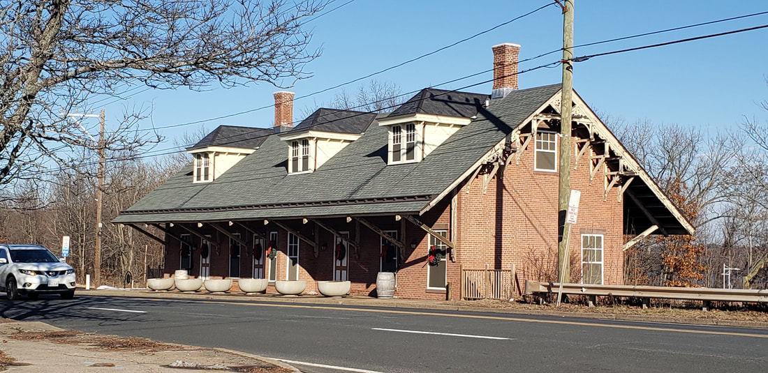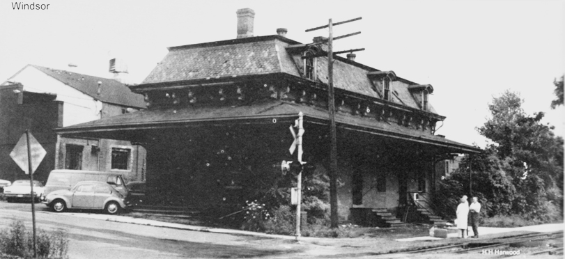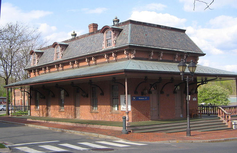 The Courant reported in March, 1870 that "The Hartford and New Haven Railroad Company are erecting a new depot in Windsor to meet the wants of their increasing business at that station. It is to be of brick, 26 by 62 feet, surrounded by a platform ten feet wide, and having a French roof, and will be an improvement that the Windsor people will appreciate. Internally the arrangements are for a ladies' sitting room and also one for gentlemen, a baggage room and a telegraph office." The French, or Mansard, roof was popular at the time and would also be seen in WALLINGFORD3 and NEW HAVEN4. When the structure was finished, the newspaper said it was "the finest of its size between New York and Boston" and praised the officers of the H&NH "that in the improvements they make, they consult permanence rather than resort to expedients to defer doing what is needed for public accommodation." Money was apparently no object with wainscotting, settees, fine carpeting, two furnaces, a ten-foot-square addtion for a women's drawing room, and a telegraph office "where a young lady operator is constantly in attendance." Abandoned for two decades after the NYNH&H exited the scene in 1968, WINDSOR2 was beautifully restored and received an NRHP designation in 1988 along with the gabled-roof freight house across the tracks. It still graces the Amtrak stop here today in 2013. [REFS: HNHAR31.1871.7; CRC18.1871.10; HDC/03/10/1870/02; NA/03/16/1870/04; HDC/09/07/1870/02; R110] [rev070113]