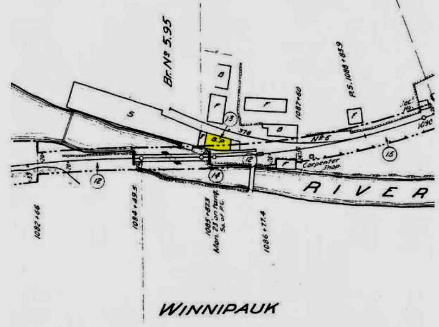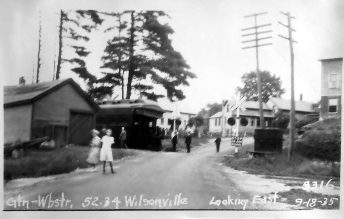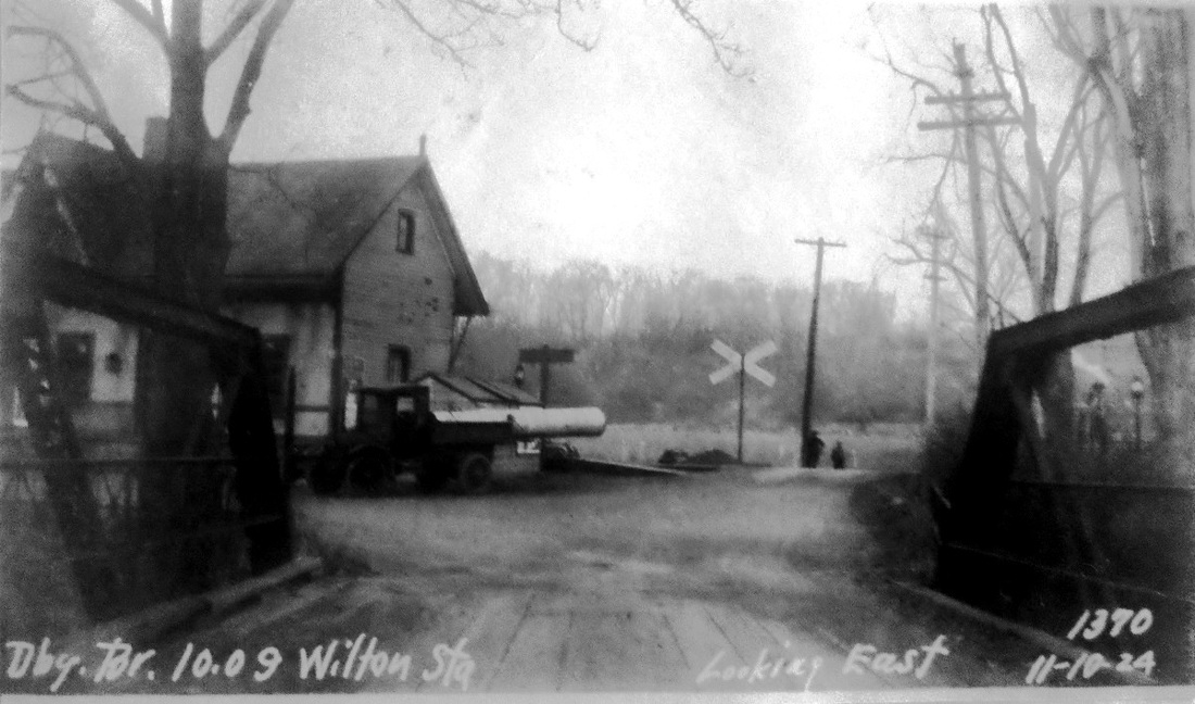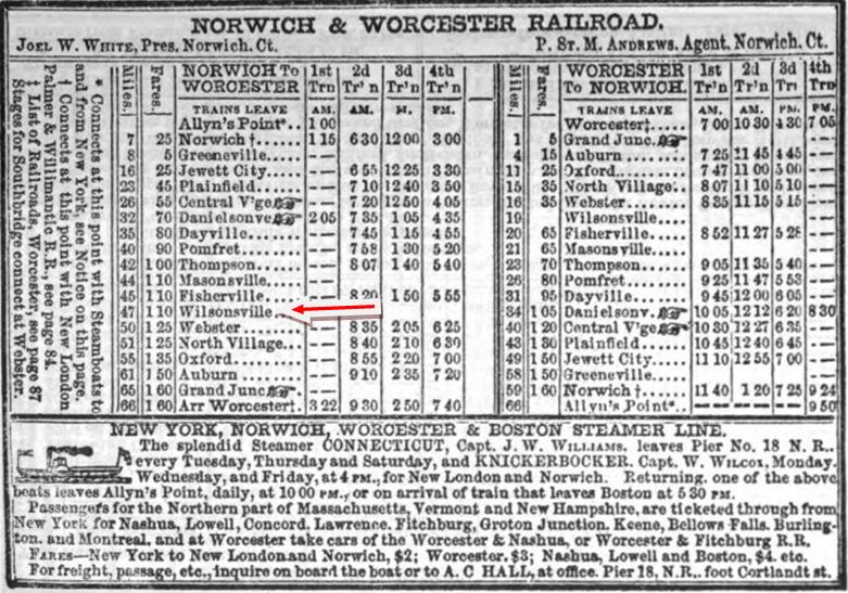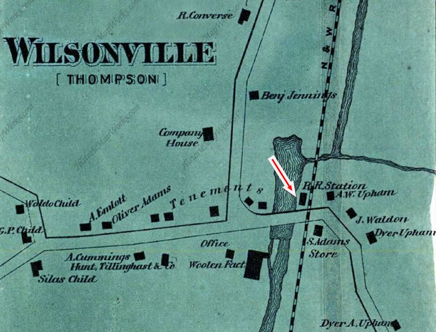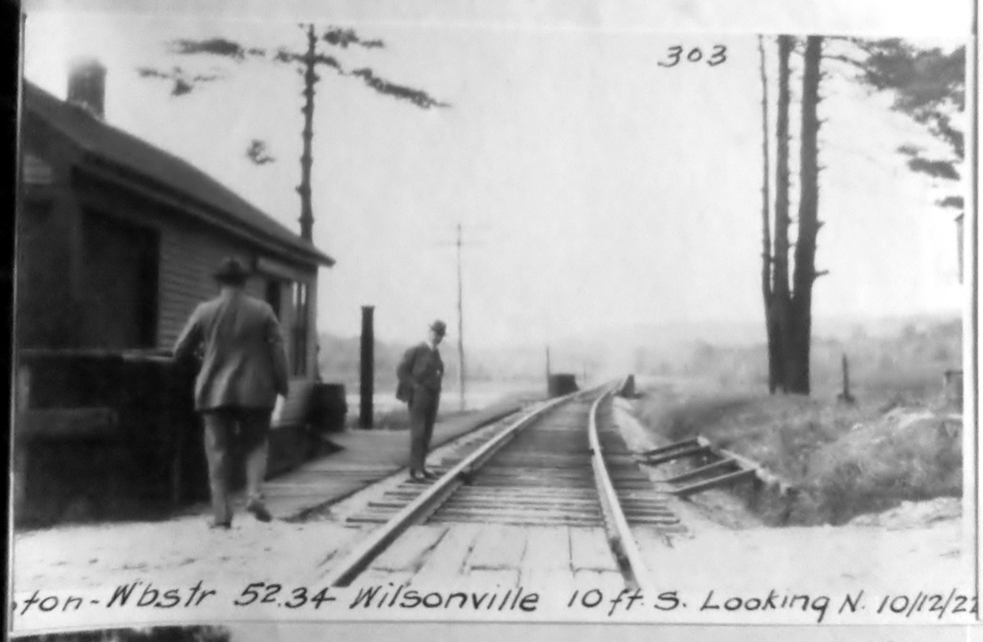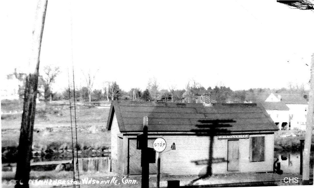 This station in the town of Thompson was also called WILSONS and sometimes confused with WILSON POINT. The 1851TT at upper middle shows this to be as early a stop as the neighboring stations, but whether it goes back to 1840 will not be known until we find an earlier timetable, and there are later timetables which do not show it either. We can also not be sure that this is the first depot built here. The PUC photo at lower middle dates to the 10/12/1922 and the one at lower right is from 9/18/1935. WILSONVILLE disappears from the Lines East timetable between our 5/4/1925 and 9/6/1926 issues. [REFS: Q84j][rev123113]