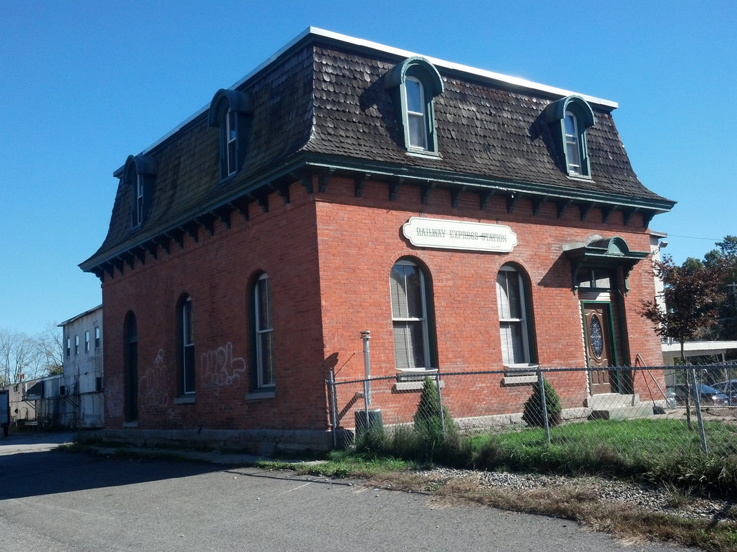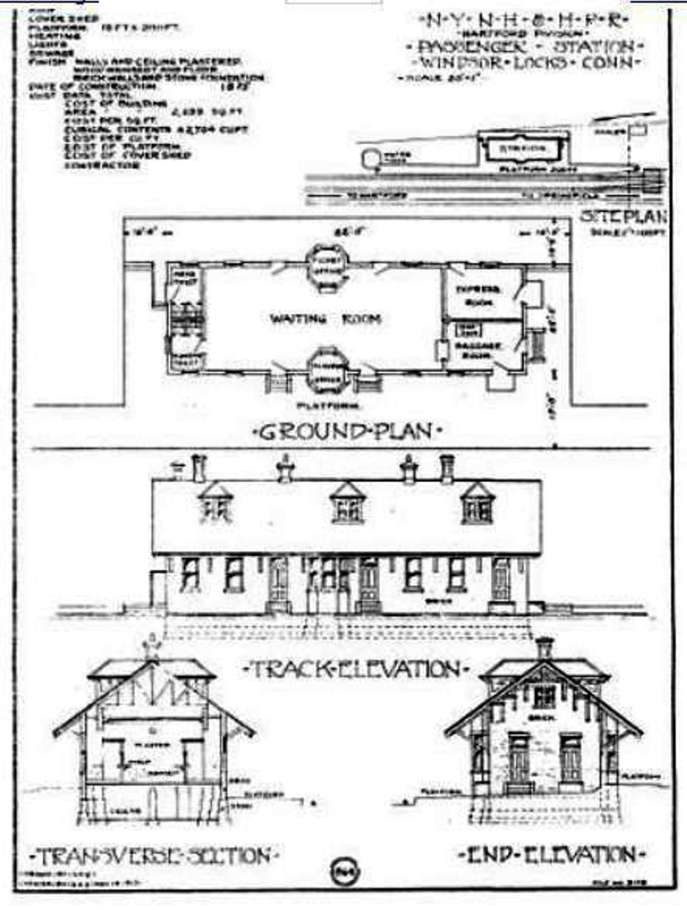 In February, 1874, the Courant reported that, because of "heavy expenses" elsewhere, it was doubtful that a new station would be built here. This statement seems to verify the fact that the depot that was expected back in 1872 never came to fruition and, in fact, this third station did not come until the 1875 date seen at [4] on the architectural plan submitted with its NRHP designation. This station was moved a bit to the south after being built where WINDSOR LOCKS1 had stood. An 1885 article says that an addition was to be put on the south end for a telegraph and express office and another report in 1886 said that "the old brick depot has been moved south in front of the hotel, and an addition is to be put on to it for the accommodation of the public." The NYNH&H annual report for 1886 says, somewhat cryptically, that the station "is being reconstructed and enlarged at an expense thus far of about eighteen hundred dollars." The southward shift is apparent when the 1913 aerial map at [1] is compared to the 1877 map in the previous entry. The handwriting on the 10/12/1933 photo at [2] may have be Irving Drake's; a Springfield-bound freight passes the water tank south of the station. The 1/2/2020 photo shows this station undergoing renovation as a community center with the support of the town. Even the boarded-up windows have been painted to look like real paned glass! [REFS: HDC/02/19/1874/02; SR/08/13/1885/07; HDC/00/00/1886/00qq; NHAR14.1886.11; SR/11/21/1902/10; R111] [rev042113, 031820]