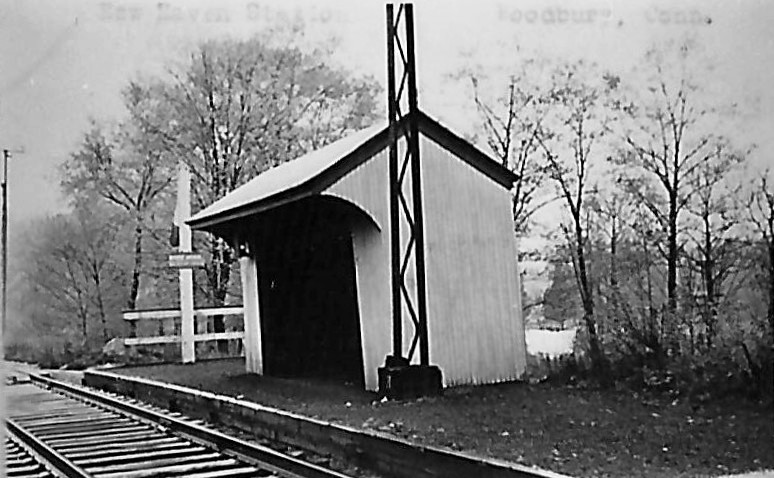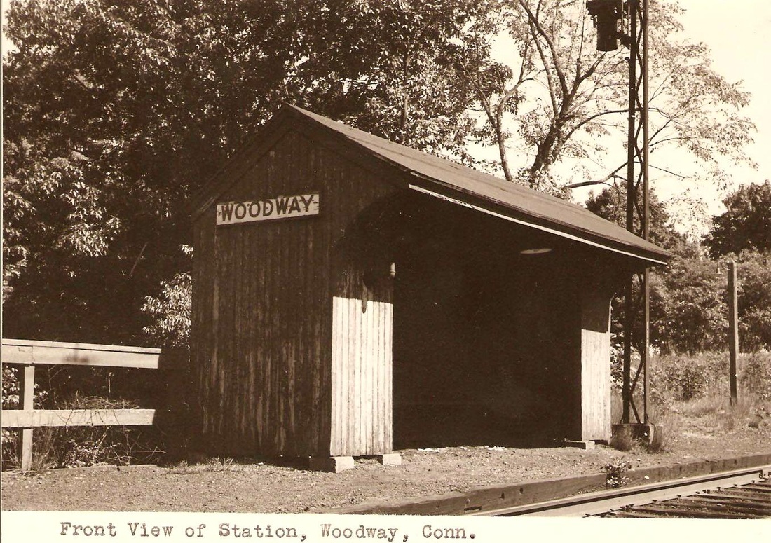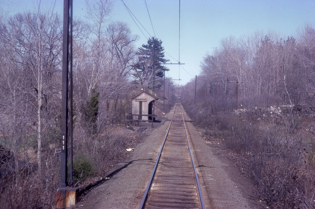 Nothing shows on the 1915 val map for this DARIEN station, which was located about a mile north of SPRINGDALE CEMETERY and a mile south of TALMADGE HILL on the New Canaan line. Our red arrow on the 1929 map at right shows the location. The nearby golf course, for which this stop was likely named and established, opened in 1916. WOODWAY is not on the 9/23/1917LWTT we have but it is on the 1919 station list and on our 1923 and subsequent timetables into the Penn Central era. Service would continue until a new train schedule of 7/17/1972 'merged' this station with TALMADGE HILL. SPRINGDALE CEMETERY was also eliminated at this time, riders using SPRINGDALE thereafter. The 1967 shot at lower left was taken by Bob Gambling on a trip up the branch in a 4400 Washboard. An 11/6/2013 conversation on the NHRHTA Forum has some interesting commentary: "The station was located right behind the house at 405 Hoyt St. I know because my family lived in that house in 1948. The path from Hoyt St was located to the north of the house. The station had a small, unpaved parking area on the east side of the tracks with access from Hollow Tree Ridge Road via an unpaved road, but I never saw a car parked there. The station structure had a single kerosene lantern that was mounted on the front left wall, and was lit and extinguished by a member of the train crew. The station also had a cinder platform in front of and to the south of the structure with the latter part having a fence on the back and side edges and a flag-stop signal." [REFS:NYT/06/27/1919/22; ICC3 (1919); 6/8/1919LWTT; 1923-1969TTs; Town of Darien. Darien, Connecticut: The Darien Community Association, 1935; NYT/08/07/1971/08; HC/08/08/1971/26A; HC/07/02/1972/74D; HC/07/18/1972/21D][rev121413]