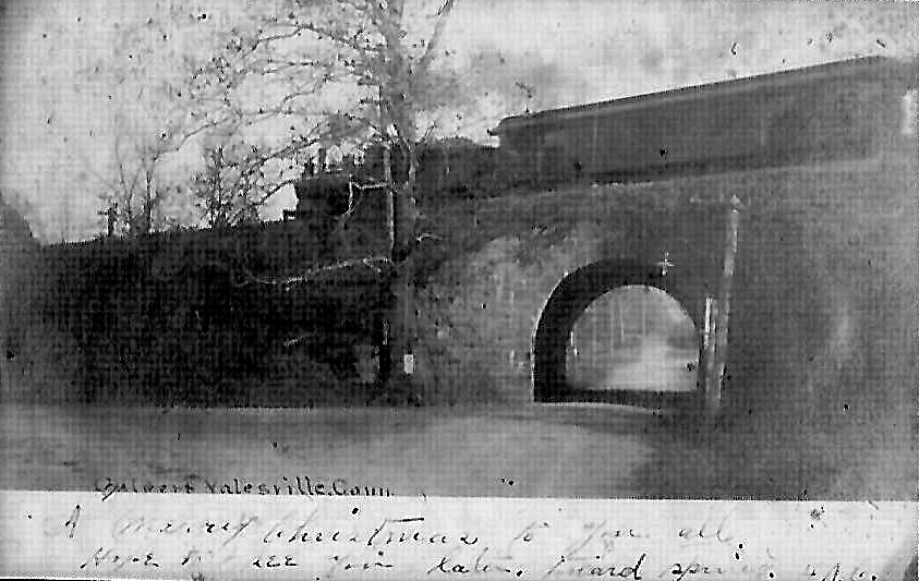 It is found neither on the 1851, 1858, or 1866TTs, but does appear on an 1871TT. The val map property section at [7] bottom left gives 5/14/1868 as the recording date for the deeded transfer of the land from H. Clark and James C. Wilson for the station grounds. This is the first time we have seen such a notation and we will check for others that may pinpoint the depot debuts as nicely as this one does. The stop, however, must already have been established because a 1/9/1868 newspaper article mentions a depot already standing with no note of newness. The station is shown on the map of the same year at upper left. Rockey says this depot was remodeled in the summer of 1889 and that may account for its enlarged size and more modern appearance. The 1893 map at [4] shows the location in the northern section of Wallingford. The val photo at lower middle is dated 8/23/1916. The 1938 SSRR list has this station sold on 11//31/1939 to J.W. Neal. The view at lower right is the famed skew arch bridge at the intersections of Routes 150 and 71, just below the site of the YALESVILLE station. Reportedly built in 1838 by Scottish stonemason William MacKenzie, it is said to be the first of its type in America and one of the oldest still in use today. Its 30-degree angle was to obviate any change either to the railroad or to the New Haven-Meriden turnpike as the H&NH was being built. The swampy nature of the surrounding land forced the railroad to build a high embankment to stabilize the right of way. It is said that there is as much foundation in the ground as the height of the arch, which was designed to be high enough to allow passage of the tall hay wagons of the farmer that sold the property. Today a traffic light coordinates alternating-direction motor vehicle traffic. [REFS: HDC/01/09/1868/02; CR/04/30/1870/02; CC/05/04/1870/04; HDC/06/28/1871/02; R1.349][rev010518]