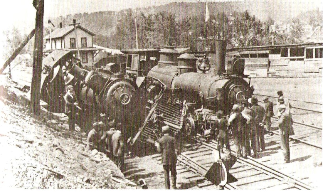 When the CW opened in 1871, it met the NRR on the east side of the borough at a point called NAUGATUCK JUNCTION on some early travelers guides and also on the RRM maps. The CW put up a freight station here at Willow St. just off of Rowley Rd. in 1872 and it can be seen on the 1877 Bailey bird's-eye map [click here] and on the 1874 Beers map at upper right. It would not be until December, 1878 that the Connecticut Western News said that the company was "building a new passenger depot near the East Winsted freight house." The Register said subsequently that a passenger station was "recently built" and that the CW had also put in 1,800 feet of track to eliminate the gap in its own rails between here and the NRR station. Motivated to save $1,000 to $2,500 per year in rental fees paid to the NRR, as well as to avoid numerous instances of "serious inconvenience at being compelled to await the moving of Naugatuck trains when on the track belonging to that company," the CW began using its own rails and this new passenger depot for its Winsted stop. Permission to do so was requested in an application to the railroad commissioners in May, 1879. The NRR, however, feeling no obligation to change its schedules and inconvenience its passengers, reacted by declining to stop here, the result being that neither company was serving the other's station. Public complaint about what the Winsted Herald called a "dis-arrangement" soon forced the railroad commissioners to rule that, when passengers wished to make connections with the other road, northbound NRR trains had to stop at East Winsted and eastbound CW trains had to stop at the Naugatuck depot. Some locals were still dissatisfied and got a Superior Court ruling that all CW trains had to stop at the NRR depot because it had been the CW's original Winsted station. The Register aptly remarked that there will now "therefore be three stopping places for Connecticut Western trains in Winsted." The 1880 NY&NE appraisal of CW properties said this two-story structure, though new, was only valued at $800. In contrast, and for reasons not apparent to us, the one-story stations at BLOOMFIELD and CANTON were said to be worth $1500. Sometime between our timetables for 9/8/1889 and 6/16/1890, this station was renamed EAST WINSTED. The lower left image is a northward view of the station. The lower middle photo from Bob Adam's collection shows the depot standing west of a 1902 collision of locomotives 128 and 183. At lower right is a shot of the concrete arch, completed by 1908, that eliminated the dangerous Rowley St. grade crossing. The bridge reportedly took longer to take down than to put up because of its steel reinforcing rods. Adams seems to say that EAST WINSTED was torn down with the NYNH&H takeover and abandonment of all the CNE stations in 1905. A 1961 photo in Nimke [3.39] shows it was not there as of that date. [REFS: WH/02/27/1872/02; HDC/08/20/1873/02; CWN/09/11/1874/02; 1875TT; 1877TT; CWN/12/11/1878/02; RRC16.31 (5/17/1879); WH/05/23/1879/05; HDC/05/26/1879/04; NHER/05/29/1879/01; NHER/06/02/1879/04; NHER/06/07/1879/04; WH/06/27/1879/05; HDC/07/07/1879/02; NHER/07/24/1879/04; NHER/08/28/1879/04; CW/NYNE 1880; RRC20.396 (9/12/1905); CRC53.1905.14; CRC54.1906.35 CRC55.1907 .47; CRC56.1908.52; Nimke 1.86,129, 3.39][rev031613]