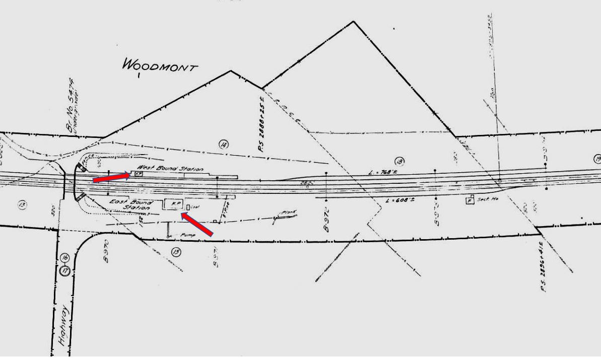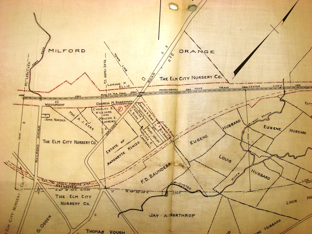 This depot was built as part of the four-tracking project, which the railroad commissioners said in their 1894 annual report had been completed, including the fact that the "freight and passenger stations in Stratford, Milford, Woodmont, and West Haven have been re-arranged to facilitate the transaction of business in each of those places." The val photo at [1] looks west and is dated 10/25/1916. The ca. 1900 real estate map at [2] shows the smaller station on the westbound (north) side of the tracks. The map at [3] shows the property owners in the area, likely in connection with the NYNH&H's plans for a large freight yard here in 1917, either to supplement or supplant Cedar Hill. Much of the property that was retained along the 1848 alignment was to be used, along with newly acquired parcels. The Courant reported late in 1916 that the railroad was seeking permission to make this "a main distribution point" to include a freight house, a transfer building, numerous classification tracks, and even possibly housing for employees. As far away as the Pawtucket Times, coverage said that railroad officials had appeared before the PUC on 1/19/1917 to testify that the yard was to be four miles long, 700 feet wide, and over 600 acres in area, capable of handling 15,000 freight cars per month, in an effort to relieve congested conditions at New Haven. The paper went on to say that opposition was expected from Milford citizens and "summer colonists" at Woodmont. The Elm City Nursery, whose property would have been given up for the project, was especially fearful of losing land said to be some of the best in the state for the cultivation of fruit trees and shrubs. The 1/19/1917 PUC Map 512 at [4] shows the extensive plans in great detail; massive would be an understatement and Orange would have never been the same. When studies showed that each train originating or terminating here would pass by New Haven Union Station and clog up the main line, the plan was abandoned. Much to the relief of residents, the Courant reported in March, 1917 that the railroad had reconsidered, among the reasons it said, was the challenge of clearing the rocky terrain in Woodmont. The stated intent at that point was to build "closer to New Haven," meaning ultimately a Cedar Hill expansion, which, though spurred on by the rail congestion during World War I, would not be completed until the end of 1921. The image at [5] shows a brand new Mack Rail bus here. The 9000 was one of the first three delivered to the railroad and were assigned to the NH&D line in January, 1922. See Track 4C, MP4.64.2. Dale Martin, former NH SS-73 tower operator here tells us that employees used to walk along the old alignment in the 1970s and find "all sorts of old stuff, spikes, ancient tie plates of some kind" and that he was told that Woodmont tower was so well made, inside and out, because it was supposed to have been the gateway to the NYNH&H's new yard facility. Perhaps that explains the lush gardens still seen decorating the newer pagoda-style concrete tower at [6] in the July, 1931 Along the Line, with the Elm City Nursery listed as one of the contributors, perhaps in gratitude for its life being spared! Dale credits Ed 'The Scoop' Russell, a former tower operator, for much of what Dale is relating, because "he seemed to know everything about everything." We recall it was a Russell descendant who donated abandonment maps to the Orange Historical Society's impressive collection of NH&D materials. The name Russell in Orange, of course, goes back to Tyler City days [see Track 1] and far earlier in local history. WOODMONT4 was presumably razed in 1929 along with its eastbound cousin. Many thanks to Assistant State Archivist Allen Ramsey for providing the map at [4][REFS: CRC42.1894.17; HC/12/25/1916/03; PTI/01/19/1917/11; HC/03/03/1917/15; HC/09/17/1919/09; HC/11/26/1920/02; HC/12/15/1921/22; HC/01/08/1922/A5; HC/10/26/1929/09; CSLIB RG041, Series 10: PUC Map 512] [rev030415, 052422]