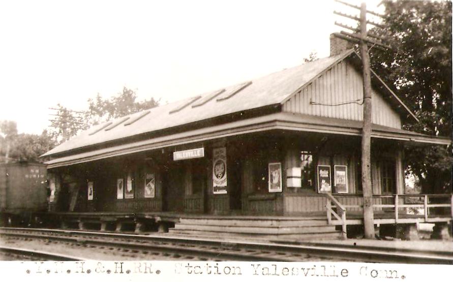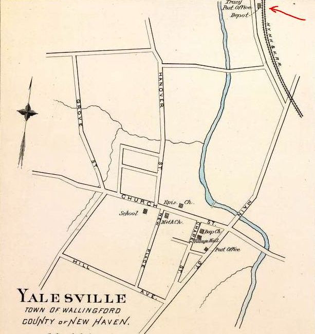 This stop on the H&NH in the northern part of Wallingford was not original on the opening of the road in 1838. As late as the Geer's Express Directory in 1858, Yalesville is shown as being served by the Meriden station. The first timetable we have seen to show it is 1871; it is not on the 1866. The stop must have been established on or somewhat before 1/9/1868 when a newspaper article mentions a the vaillage of Hanover in Meriden as "... one mile northwest of the Yalesville depot." The location is seen on the 1868 map at [1]. The title data valuation map at [2] gives 5/14/1868 as the recording date for the deeded transfer of the land from H. Clark and James C. Wilson "For depot grounds only." These purpose resstrictions are rare but always worth checking for. [REFS: HDC/01/09/1868/02; HDC/01/13/1868/02; CR/04/30/1870/02; CC/05/04/1870/04; HDC/06/28/1871/02]