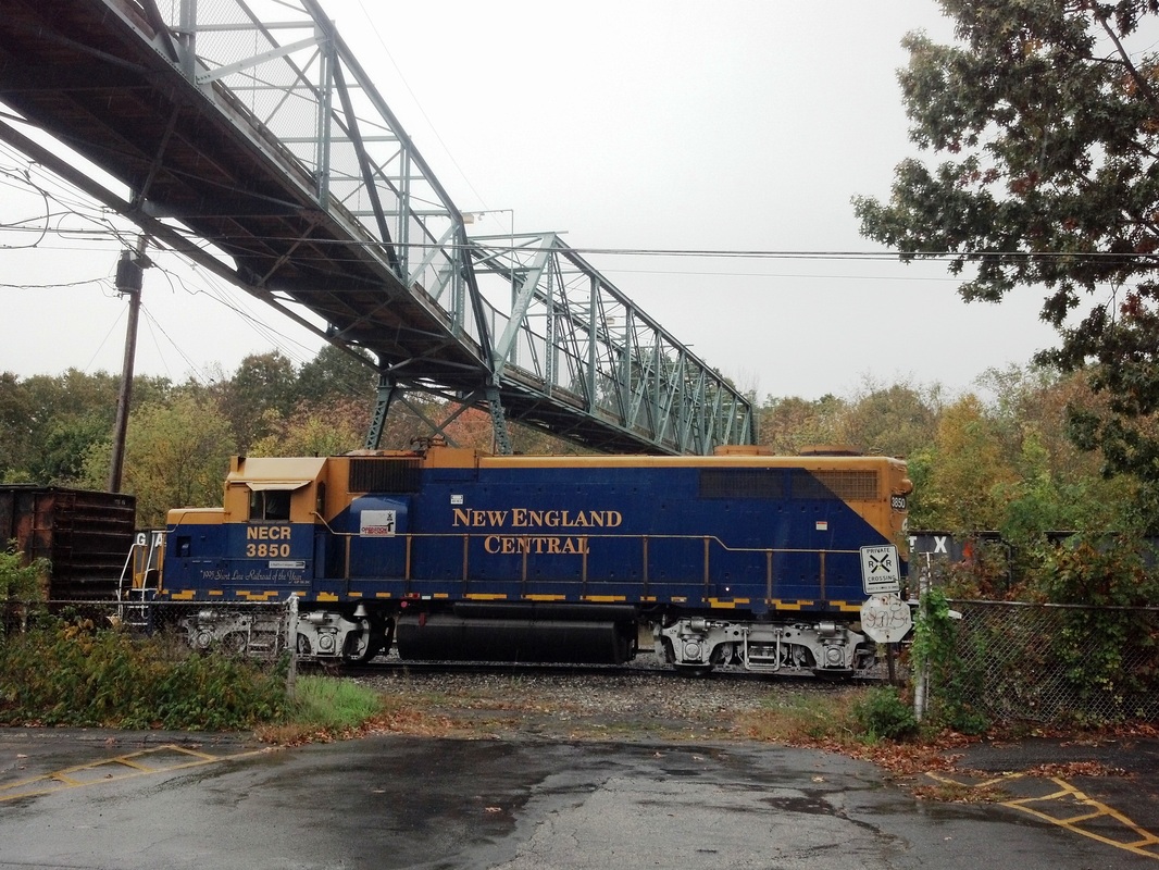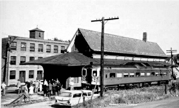 After an absence of 36 years, rail passenger service returned to the Thread City on 11/2/1991 when the Montrealer began to make one stop daily in each direction. About 1,000 people gathered for the midnight homecoming at the Bridge St. platform, which was decorated with balloons and signs for the occasion. The Montrealer itself had only started running again in July, 1989 after being suspended because of dilapidated track conditions on its former Conn. River routing between Springfield and Vermont. The switch to CVT tracks was to Willimantic's advantage. With nearby Eastern Connecticut State University and the University of Connecticut to add intermediate destination traffic, success seemed assured, but Amtrak announced in December, 1994 that it was dropping the train as part of a plan to eliminate a $2M annual deficit. The last Montrealer passed quietly through Willimantic on 4/1/1995. The image at [1] shows the plexiglass shelter that Amtrak put up. The old 'gallows' signal that controlled the CVT/NYNH&H crossover at Bridge St., is seen in the historic photo at [2] taken by Charles Palmer with his parents on the concrete platform. This site was an ironic precursor to Amtrak since it is about as far as the NYNH&H got with their plans to build a station here in 1955 before the hurricanes and floods of that year eliminated passenger service altogether. The site, with concrete platform and lights still remaining, is seen to the right of the third P&W locomotive in the same view at [3] that the late Lee Carlson took in 2010. West of Bridge St. were the freight yard, depot and office. The latter structure dates to 1870 and was originally the office building of the Windham Cotton Manufacturing Co., some of whose property the NYNH&H bought in 1892 to move the freight yard here from the congested area at the passenger station. The mansard-roofed structure, seen at [4], still stands today and was given an NRHP designation in 1982. Our photo was taken on 10/13/2012. The view at [5] is presumably in the aftermath of the 9/21/1938 hurricane, still the mostly deadly in Connecticut and New England history. The shot looks west at the signal and the crossing shanty from which the gate tender operated the signal and the Bridge St. gates. A similar shot at [6] shows CV 467 crossing Bridge St., the operator standing in the street with his STOP sign. Interesting side note to the history of this location is that protecting the crossover was the responsibility of the NLW&P because of its 'junior' status at the junction. The signal is variously said to have been erected in 1852 or 1854 with no firm documentation that we have ever seen. Perhaps it came as early as January, 1850 when the NLW&P began to extend its line north from the depot and had to cross the HP&F in the process. We also think that the first placement was somewhere further east toward the downtown passenger station where the original crossover was located. See image [3] at WILLIMANTIC1. The entire operation at Bridge St. was made obsolete with "new flashing light signals" in use on 12/29/1961. Reportedly still standing in 1962, the signal was likely removed in that year. We have been unable to find either an exact date or the party responsible, or the fate of the venerable structure, which was likely just destroyed with no appreciation of its historical significance. Today the access road to the Connecticut Eastern Railroad Museum starts here. Be sure to look to the right to see Dick Arnold's meticulous recreation of the 'gallows' signal, dedicated on 5/21/2011 to the memory of member Frank Johnson. To understand the workings of the signal, there is a nice modeling article referenced below. Fran Donovan's notes at UConn mention the fact that there was only one arm prior to 1873 when the Air Line opened and created a triple intersection of rail traffic here. [REFS: HTI/01/05/1850/02; HC/12/16/1961/12C; HC/12/19/1961/28C; HC1/12/29/1961/20C; HC/11/02/1991/??; HC/03/09/1992/C1; HC/03/21/1992/C8; HC/12/15/1994/A11; HC/01/25/1995/A11; HC/04/02/1995/D7; T.J. Sommer, Model Railroader, October 1963, p55ff][rev010714; 052319, 041922]
