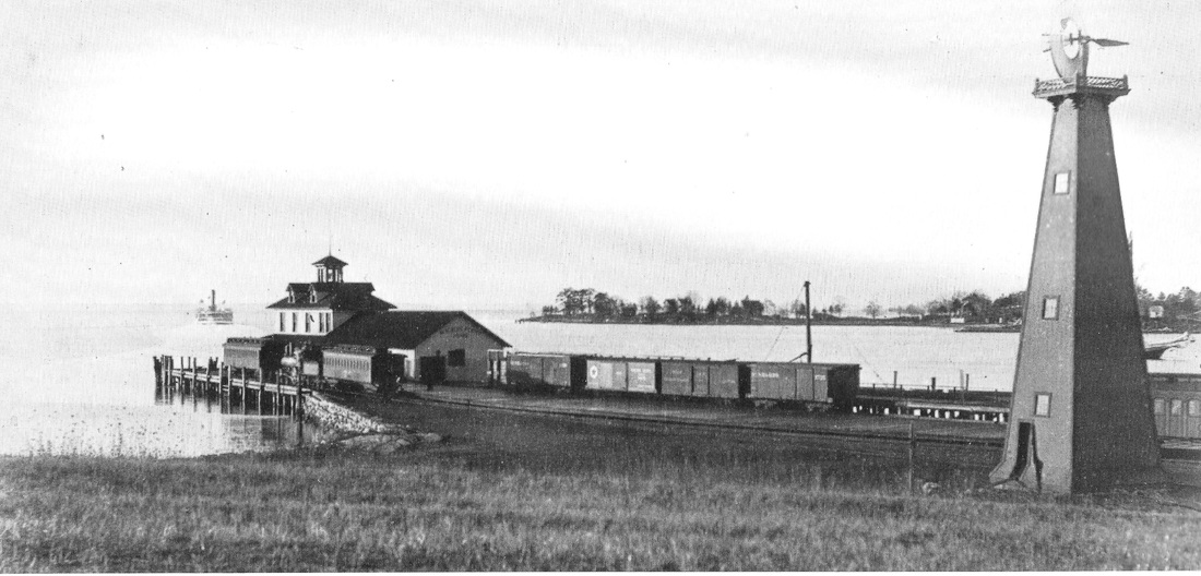 The new warm-water Norwalk terminus of the D&N opened on 7/4/1882 with better access to Long Island Sound and less likelihood of freezing than the D&N's 'downtown' dock on the Norwalk River: see NORWALK/D3. Gregg Turner says the view at [2] is 1882 and we are inclined to agree with the pastoral setting and quiet activity. Cornwall says the first passenger train ran to the point on 7/4/1882. People and freight were transported to and from this point by the Pegasus and the Cape Charles to New York City beginning on 9/18/1882; coal was also received here for shipment inland. Day excursions to New York were popular here. The boat seen in the shot at [1] is presumably approaching and will soon fill the empty dock with passengers to board the waterside train. The windmill in the shot at [2] likely pumped fresh water for the terminal complex. The HRR lease of the D&N in 1886 would bring an expansion of the facilities in 1888, including a pier that jutted out 500 feet into the Sound for the accommodation of larger boats and more being simultaneously serviced. By 4/19/1889 a newspaper article mentions a "... new water supply for locomotives..." as well as a new turntable and "heavy iron transfer bridge resting on its mammoth pontoon..." as part of the improvements. The map at [3] is from the 1892 Norwalk city directory. This complex was in the midst of this almost-completed expansion when a fire of 5/23/1889, caused by an overturned lamp in the freight house, ignited and quickly leveled the buildings before firefighters from Norwalk could arrive via a train dispatched from here. [REFS: NHER/09/14/1882/04: Pegasus; SAD/09/29/1882/04; CRC30.1883.17; RRC map 434 (11/28/1888) for extension of terminal grounds; CDE/12/28/1888/01: HRR buys Cape Charles; C102: 1882; P46,62][rev030318]