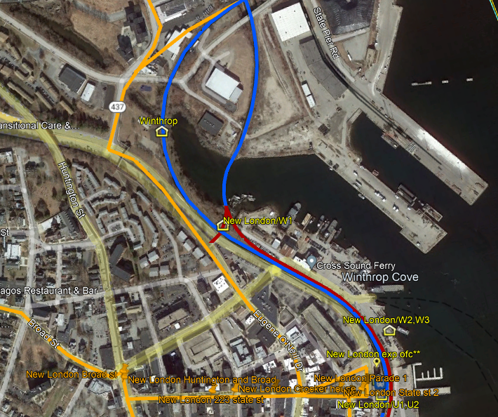 This was an obscure stop about a half mile east of NEW LONDON at the head of Winthrop Cove, probably for the convenience of locals and seasonal visitors to the shore area. The 5/18/1891 NYP&B timetable at [1] shows it as a flag stop only on one train eastbound from STONINGTON LANDING at 6:48 AM. In 1892, the NYP&B leased its lines to the NYNH&H. The new operator's September, 1893 public timetable lists this as an 6:47 eastbound stop, with no trains stopping in the opposite direction. We have no additional information at this time. [add011523]